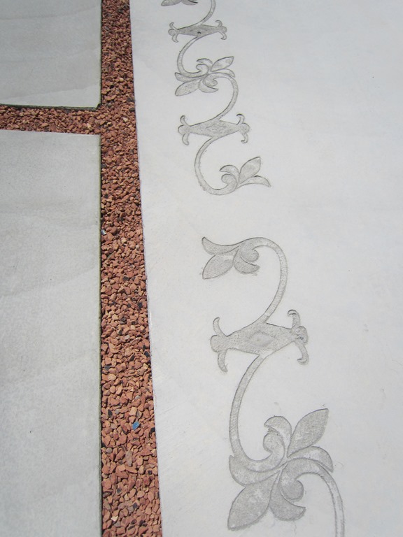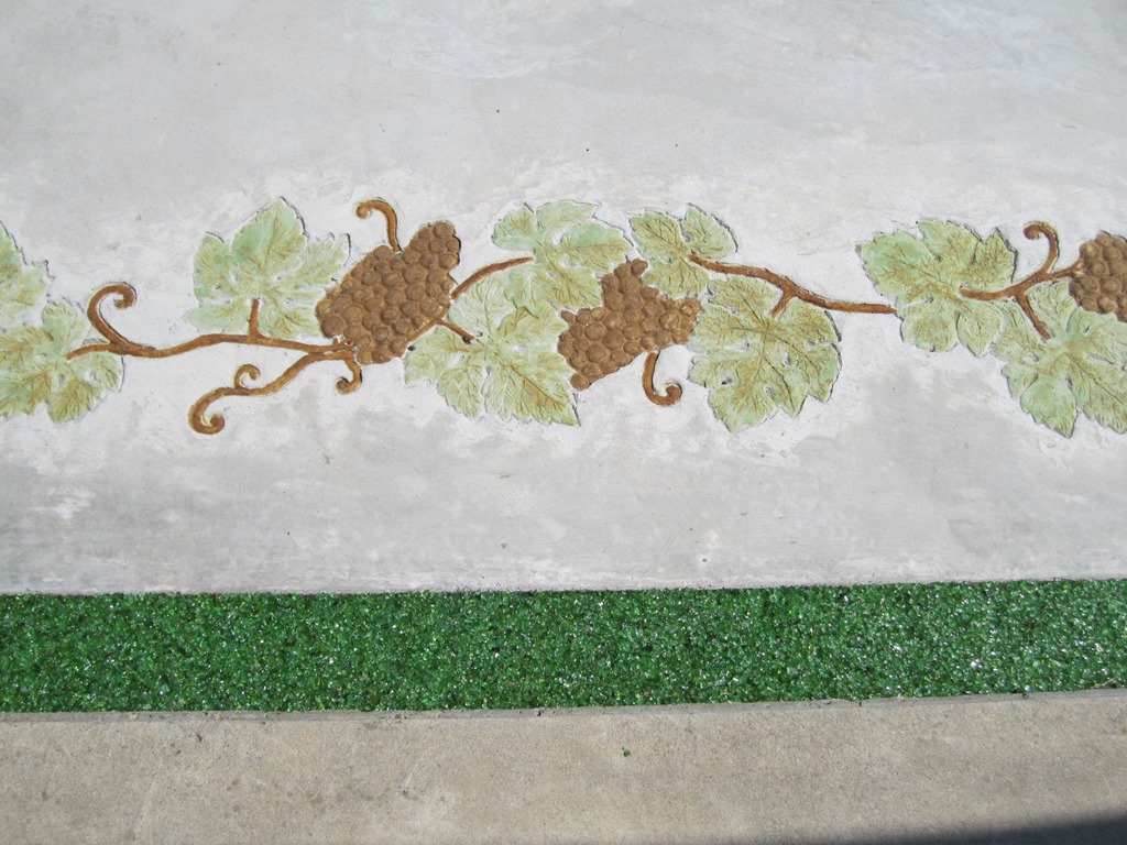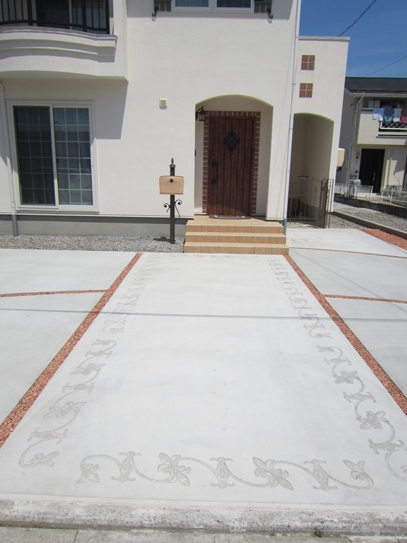 トレドの外構契約のお客様のコンクリート床仕上げで、ご希望があればボーダーアートの形押しをさせて頂いています。トレドで施工できるデザインはグレープヴァイン・オータムアイビー・ドルフィン・フルールドリスの4タイプの模様で色付けは別途です。色付けを希望されるお客さまには色付け時に使うステインは市販はされていないので当社から購入して頂いています。当社で用意しているステインのカラーはブラウン系とグリーン系の2色になります。 色付け自体は簡単な作業でできるのでお客様にお願いすることが多いです。