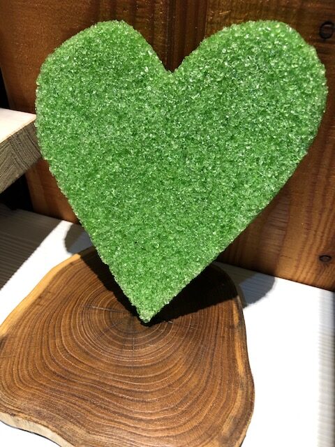 トレドオリジナルのガラスでできたアイテムはお客様から、きれい!かわいい!とよく言っていただき、人気のアイテムです。先日紹介されていた流し込みガラスのニューカットダルやカットダルJタイプ、ガラスブロック以外にもこんなガラス商品があります。これは「クリスタルハート」です。空き瓶を粉砕したリサイクルガラスを強度のあるウレタン繊維化樹脂で固めたものです。W140×H140とニューカットダルやJタイプよりも大きめのサイズ感でコンクリートに埋め込んだ時にしっかり存在感のあるハートが表れます。