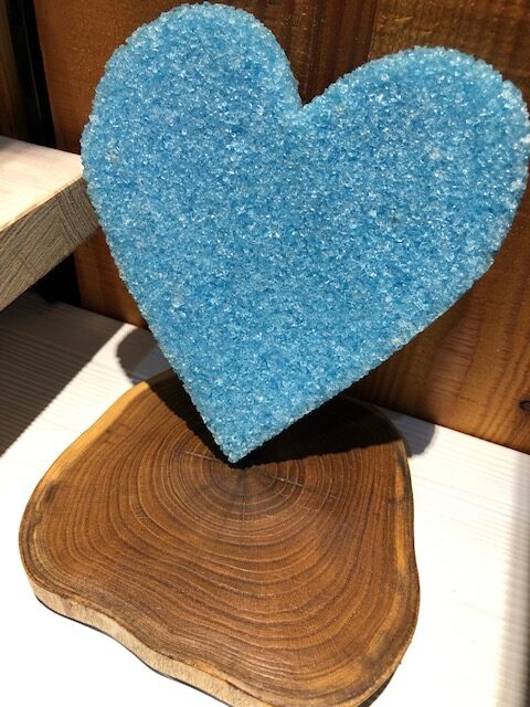 大きなハートの形を生かして四葉のクローバーの様に見せてあげるのも人気です。このクリスタルハートはすでに固められたものですが、まだ固めていない粉砕ガラスの状態を現場の職人さんたちが樹脂と混ぜて施工もできるので、写真の様にハートと合わせた色の目地も作れます。統一感があっていいですよね。