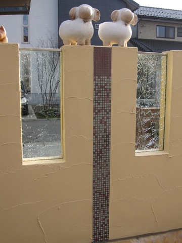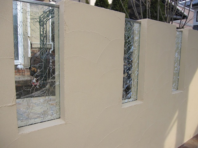 今回の現場は角門柱の袖に大人気ジュエルグラスのメターW400H1200を組み込みました、サイン・ポスト・笠木は