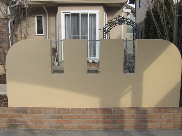道路側の境界に、ブロックを積み上げFウォールで仕上げています、塗り壁施工するときには必ずトップコートで表面保護を