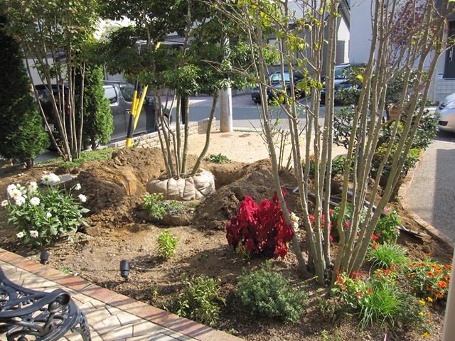 テコラ(破砕瓦)をしきこんでいます、テコラの下には防草を敷きこんでいるので草取りは楽です。