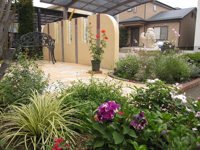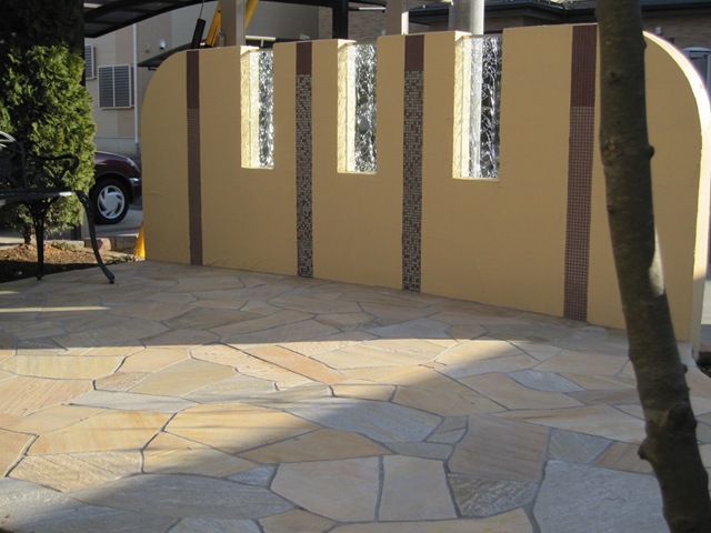門柱横のアプローチはステンシル工法のヨーロピアン模様をテラコッタ色で施工しました、通路の両脇は土を見せずに