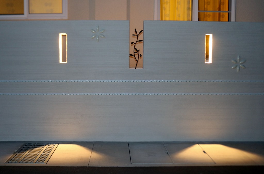 昨年末に完成させた土留めを兼ねた塗壁のエクステリア施工現場です。南側の道路境界が敷地よりも30センチ以上下がっていて土留めが必用だつたので、東西に化粧ブロツクを3段積みにして上部に樹脂板のマイティウッドのホワイトを取り付けました。建物の前になる中央部分は長い塗壁を両サイドをRにしてスリットにRフィックスフェンスを取り付け、何も取り付けていないフィックスには天端にLED照明を付けました。