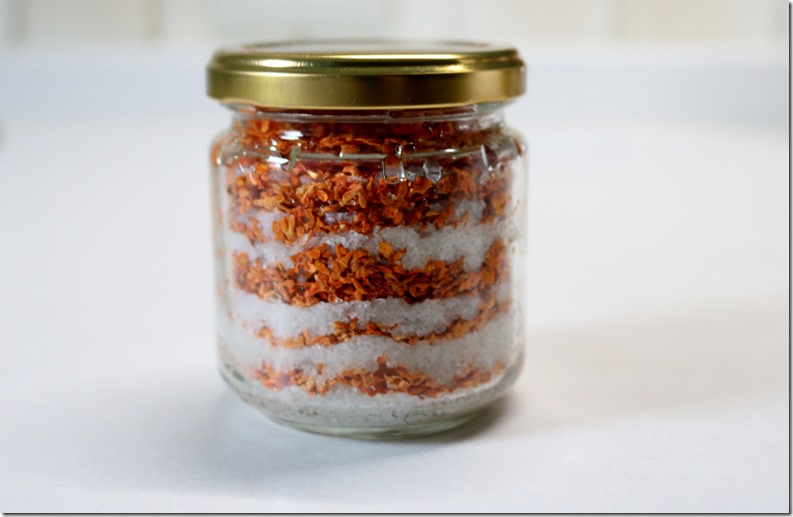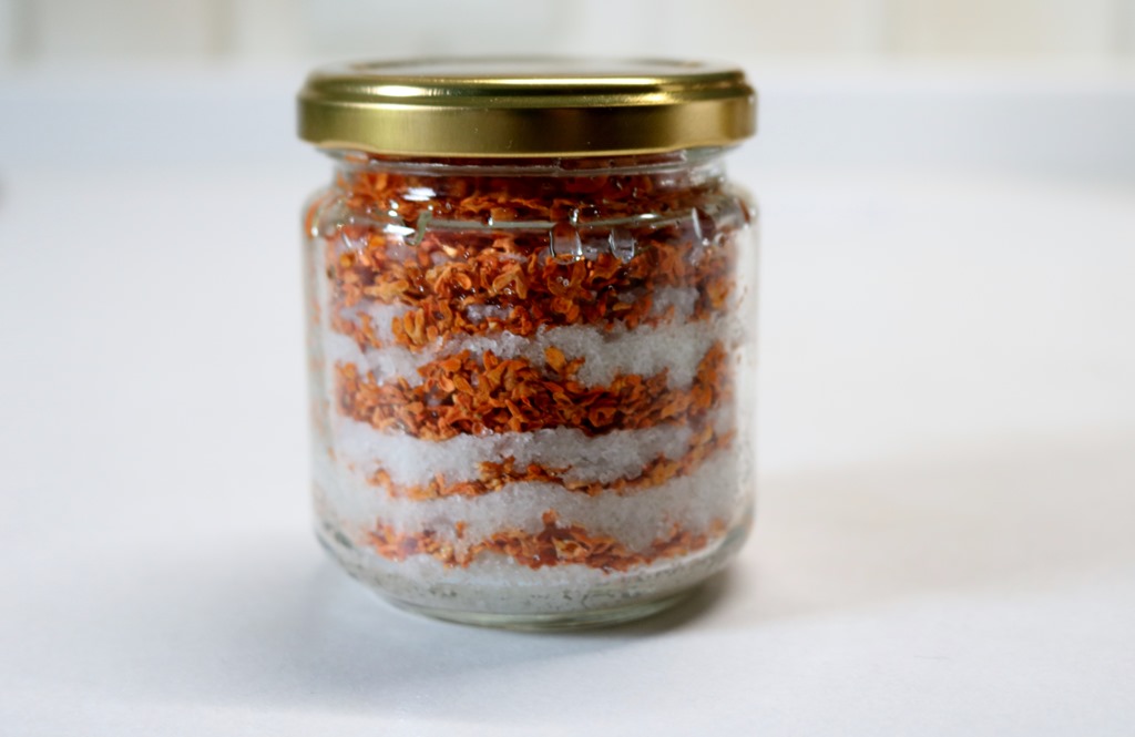 先日、キンモクセイ茶を作ったときに、花が余ったので、残りの花はポプリにしました。 キンモクセイの花は、通常のポプリと違い乾燥させてしまうと香りが無くなってしまうので、塩と花を交互に詰めてから密封してから冷蔵庫に入れ、ひと月ほどすると香りの強いキンモクセイのポプリが出来上がります。