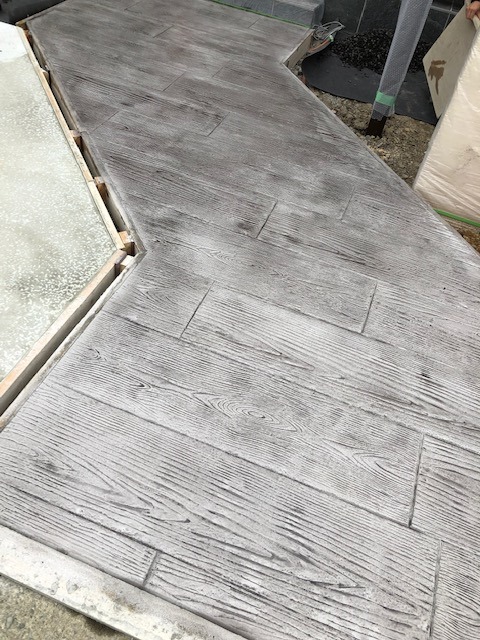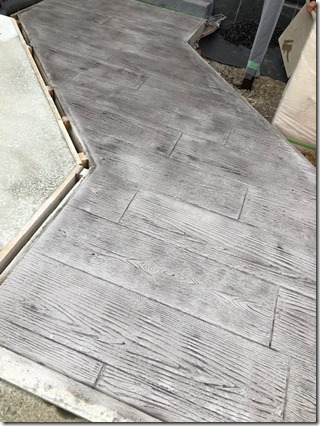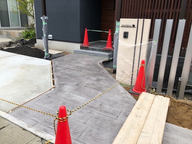 スタンプコンクリート施工のお手伝いをしてきました。まず始めにコンクリートを流し入れてコテで均し、次はコンクリート上にスタンプハードナーという粉を撒いて、また均していきます。撒いている時は粉なのに、コンクリートに付くとペーストの様になってとても不思議でした。少し乾かした後に木目のスタンプを押していきます。線がずれない様に慎重にスタンプを置いていくのが予想以上に難しかったです。最後にシルバーグレーの塗装をしました。木目は茶色のイメージが強いですが、グレーだとシックでかっこいい印象になります。