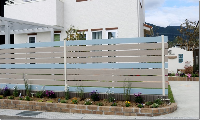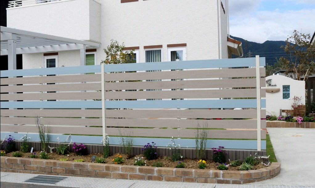 リビング前に施工された、目隠し樹脂フェンスは、ディーズガーデンの耐候性樹脂フェンスのアルファウッドです。当社がお勧めてしている樹脂板フェンスは、樹脂板フェンスとして初めて紹介されたマイティーウッドと今回紹介する現場で使用したアルファウッドです。 樹脂板