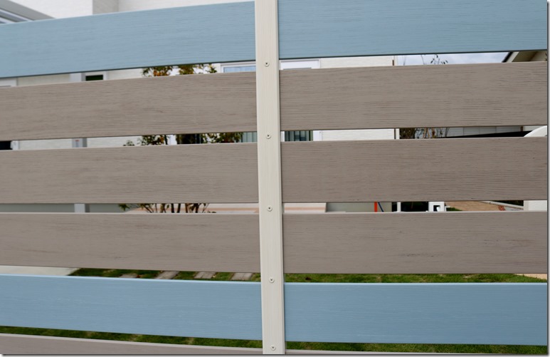 アルファウッドの部分を大きく写すと、樹脂板表面の感じが分かってもらえると思います。板と板との隙間は2㌢で、このぐらいの隙間が、あまり圧迫館が強くならず、良い感じの目隠しになると思います。
