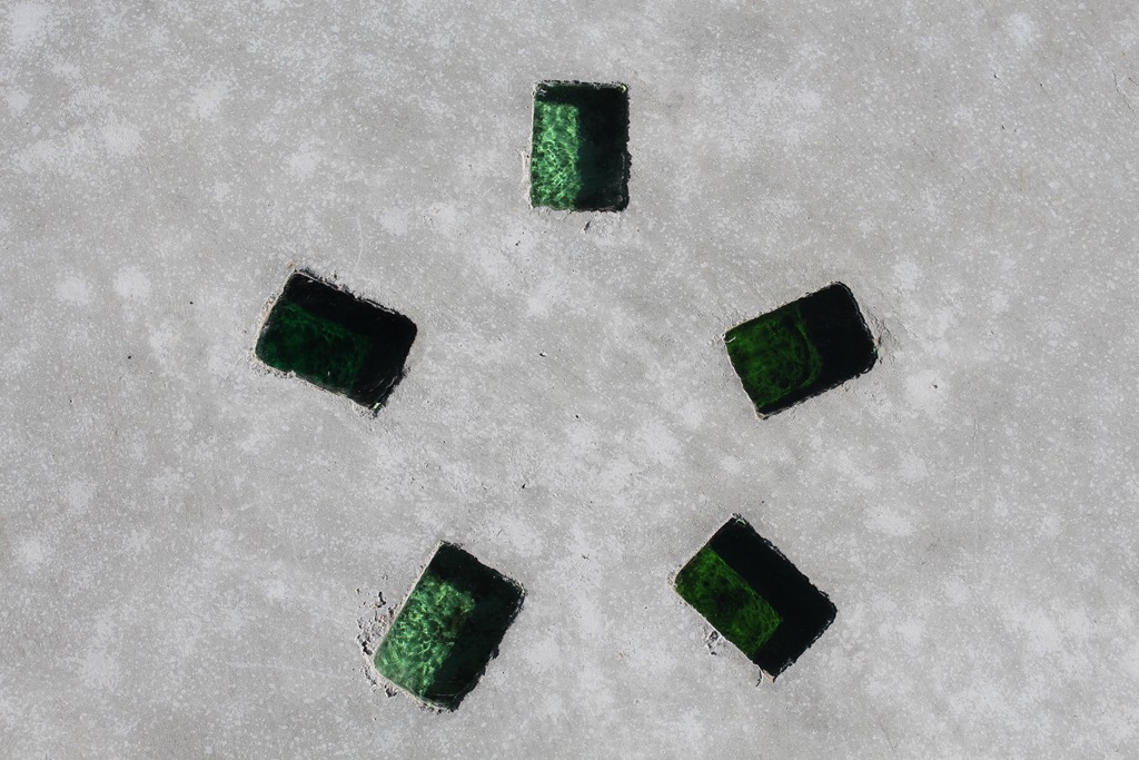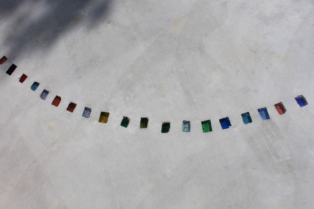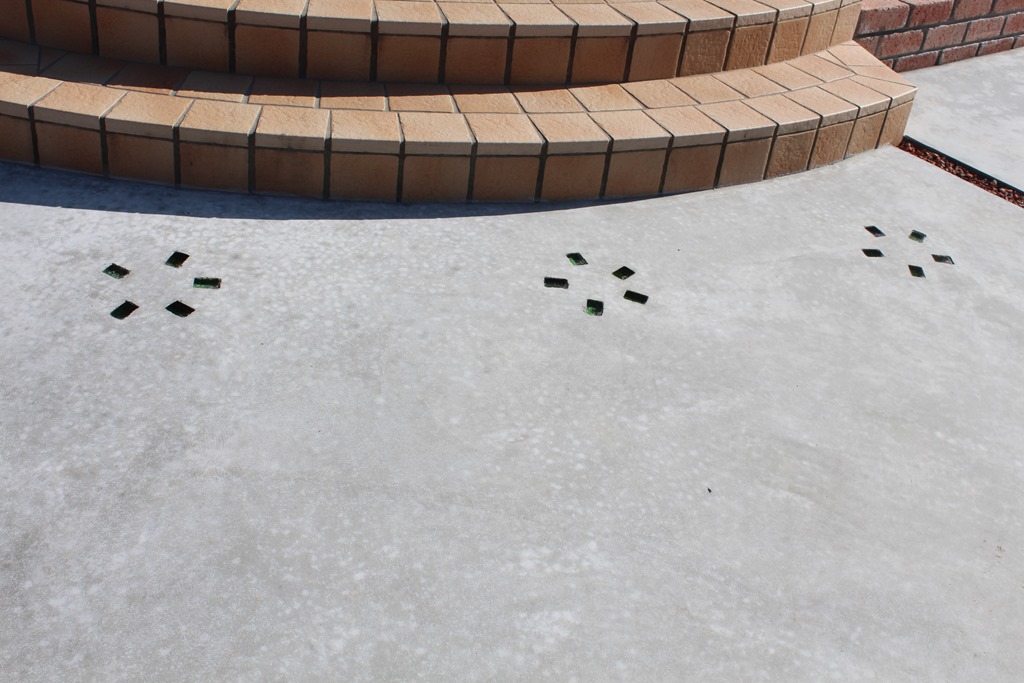 当社では、ガラスを埋め込んだ現場が多いです、その事がtoledoの特色になっていることも事実です。 もともとは存在することのなかったカットダルを作ろうと考えたのは、コンクリートの床に工夫をしたかったからです、ステンシル工法・スタン゜工法のようにコンクリートの打設時に色粉を撒き、色と模様をする事は、今では、どの会社でも取り組んでいる事です。他に方法がないのかと考えてみてガラスを埋め込んだら、どうだろうかと思いました。 丸いビー球だと取れてしまう事があり、薄いガラスだと割れてしまう、それなら、厚みのあるガラスを四角に作ったら・・・それで生まれたのがカットダルです。