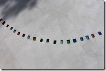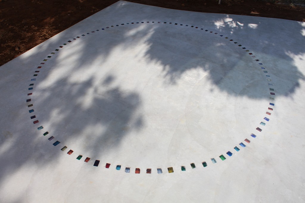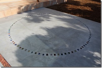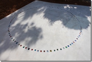 リビングの前に作られたタイル貼りのテラス、そのテラスの階段を下がると庭の一部にコンクリートを打ちこんだスペースがあります、グレーのコンクリートの床に直径3メートルほどの円を100個以上のカットダルを並べて作りました。色は、ほとんどの色を使用しています。カットダルの埋め込むタイミングはコンクリートを打設してから、あまり硬くならないうちに行います、100個以上の埋め込みは時間との競争です。特に夏場だと大変です。