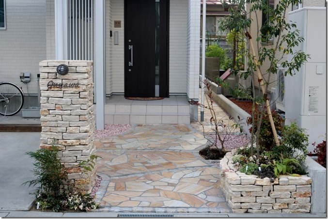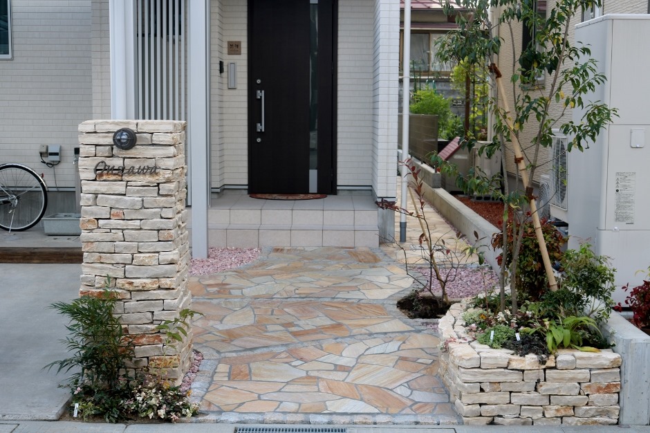自然石を門柱・通路・花壇とふんだんに使用したナチュラルエクステリアの現場です。 お客様の希望で素材選びも時間を掛けて打ち合わせをして、お客様の要望に近いナチュラルェクステリの完成です。門柱に積まれている自然石は、クロアチア産ドブロブニクです。花壇も同じドブロブニクで垂直には見えませんが、これが自然石の魅力です。 道路から玄関までと建物の横を通り庭に向かう通路も南米産の自然石を貼っています。縁取りは御影石のピンコロで![]()