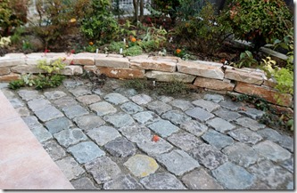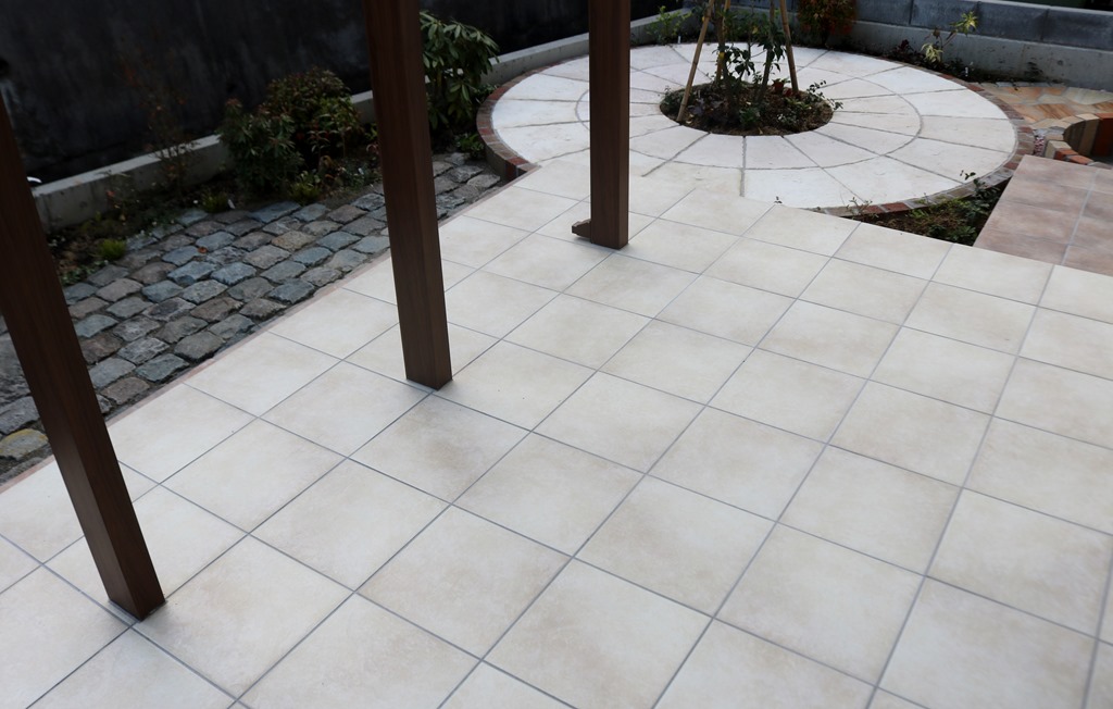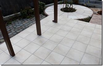 天然石が貼られた通路を抜けて行くと庭に出て、リビングの前にLIXILココマオープンタイプテラスが取付けられ、床は300角タイルを二色使いで仕上げ、タイルテラスと庭の花壇の間の床は、自然石の欧州石でベルギー産の石を敷きつけました。 建物横の石貼り通路を行き、最初に出会うのが、こちらは石全石ではないのですが、ヨーロッパで大変人気のある擬石ブラッドストーンで床よりわずか立ち上げジロンデカラーのサークルがあり、センターには植木を植えました。