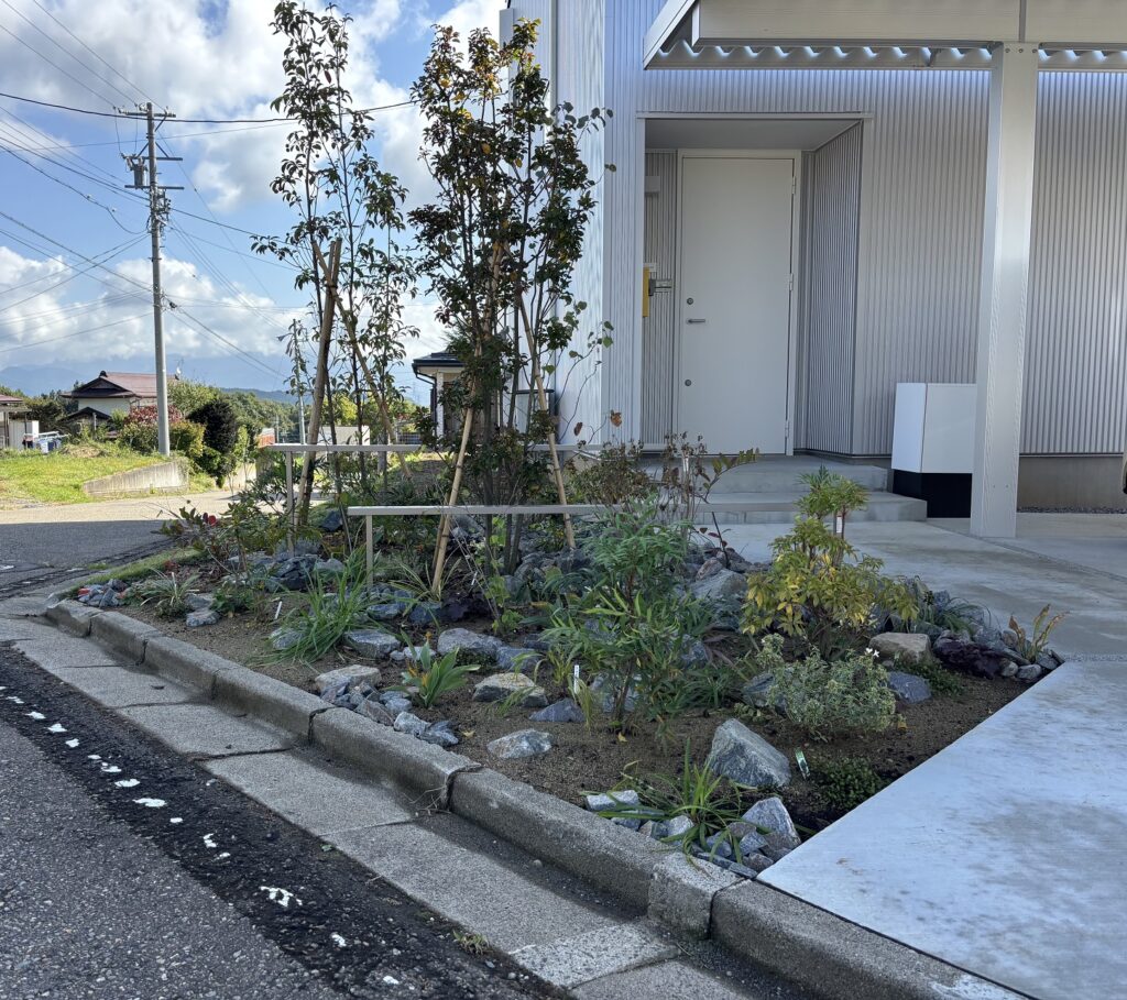 土留め以外にもカーポートや土間コンクリートを施工させていただき、アプローチ脇には植栽帯を設けました