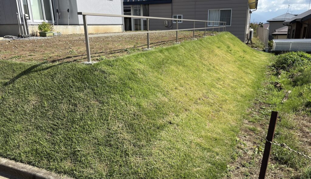 丁寧に芝刈りもしていただき、こんなにすっきりとした綺麗な芝の法面が完成しました