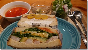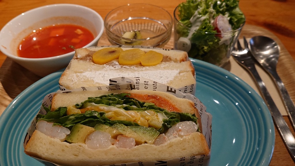 長野グランドシネマに映画を見に行ったときに、食事をしてからと思い近くを歩いてお店を探していると、すぐ近くに フルーツ&ブレッド サンチがあり、引きこまれように入店してウィンドウにいろんな種類のボリューミーなサンドイッチが並んでいて、相方はサンドイッチ2種類 結構なボリューム、私はグリーンカレーかな、ご飯でないとなんだか物足りないようで。