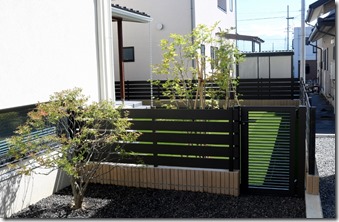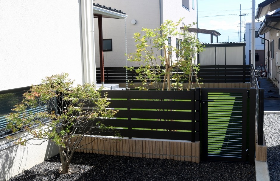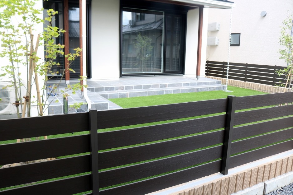リビングの前の庭を樹脂フェンスのアルファウッドで囲み、駐車場側に出入りする為のアルミ門扉の片開きを取付けました。 人工芝の下地に雨水が浸透して行くように砕石路盤を作り、その上に防草シートを敷き込み、人工芝です。