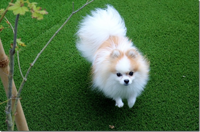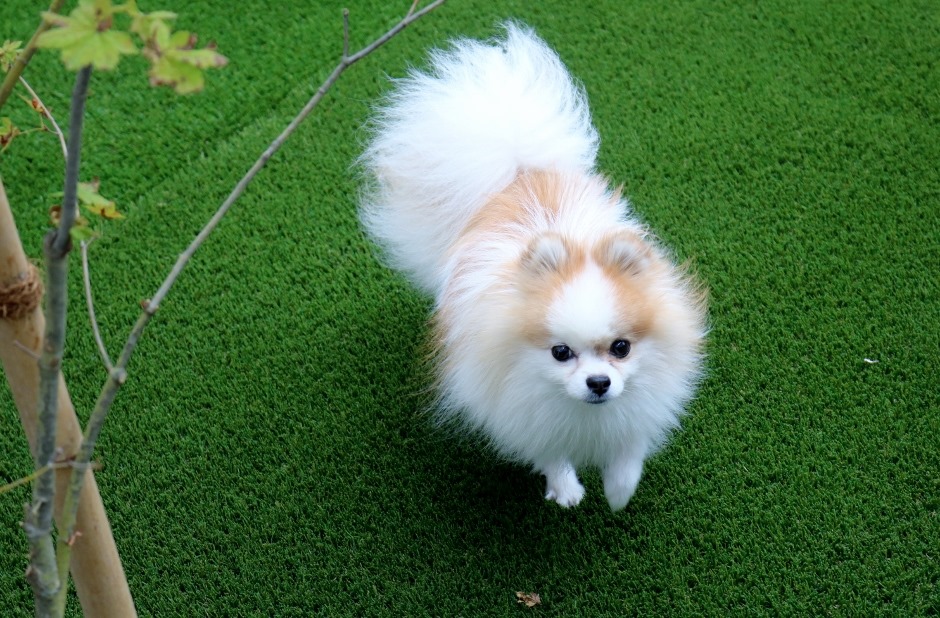 外構工事が完成した現場の写真を取りにうかがいました。庭に張詰めたドックランの為の人工芝に、家の中に居たワンチャンを連れてきて庭に放してくれました。 かわいいね