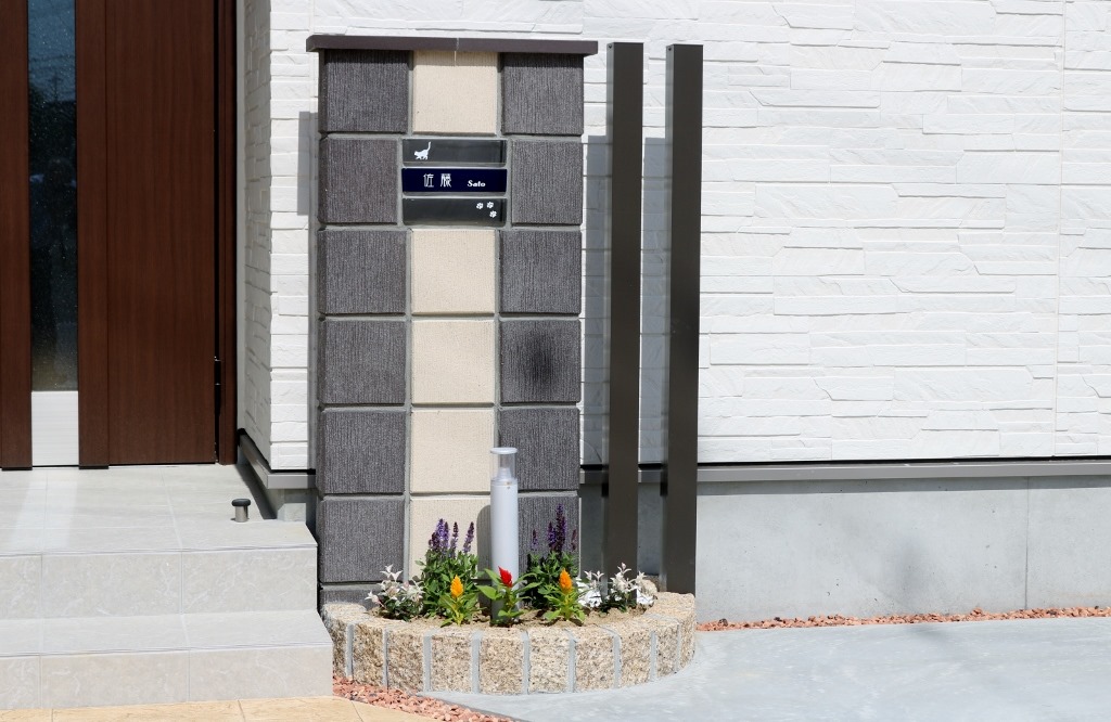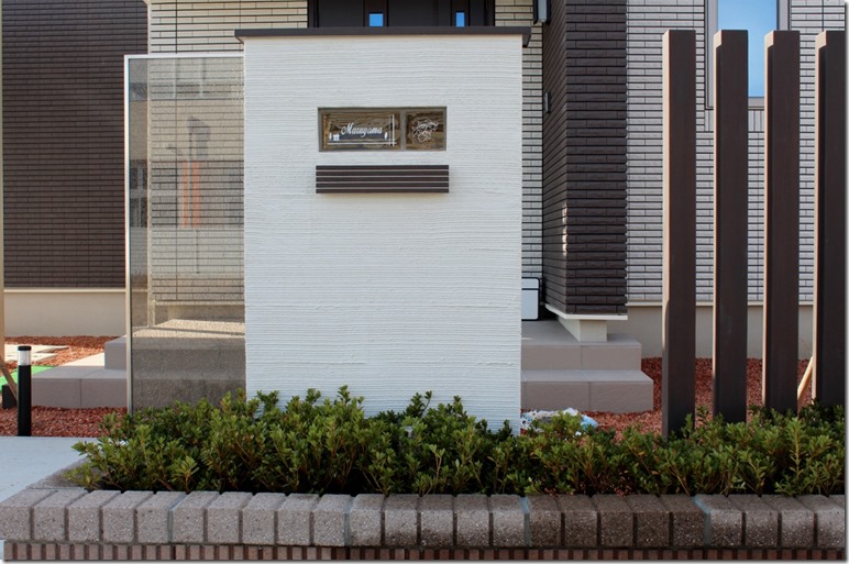駐車スペースを考えると、門柱の位置が難しかったので、玄関ポーチの横に2色のレンガブロックを積み、ベルチアンガラスブロックを組み込んだ現場です。