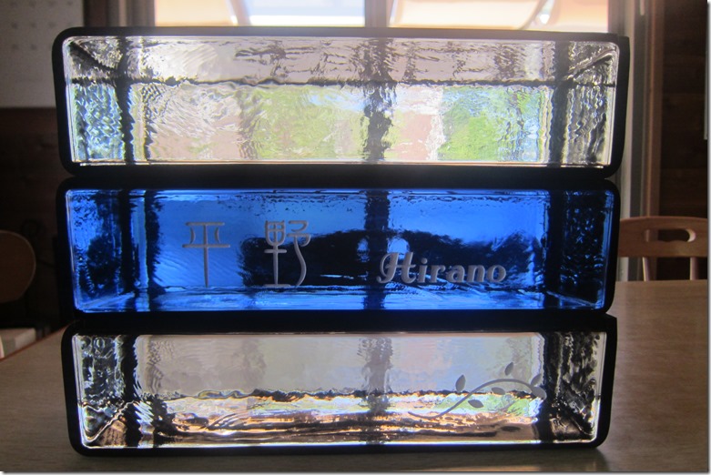 作りたてのベネチアンガラスブロックサインを作業台に置いて撮った写真です。 ひとつひとつにガラス保護材を巻いて傷が付かないようにしてから、門柱のブロックを積む時に、一緒に組み込んでいきますが、この状態で見て貰うと、ガラスの透明感が分かってもらえるのではないでしょうか。 ベネチアンガラスブロックサインは、トレドにしかできない事もあり人気で、今迄に多くの現場で施工していすが、見かけたら、それはトレドの現場です。
