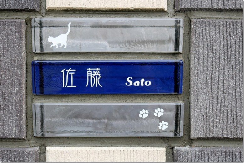 ベネチアンガラスブロックを3段積んでのサインです。 平面ではなく側面に文字・デザインを彫って作ったもので、名前は3段の中段にブルーのガラスで、上段・下段はクリアにして、どちらにもお客様が考えたデザインをワンポイントで入れています。一点物のオリジナルデザインはその家の顔になる門柱を、素敵に見せてくれます。