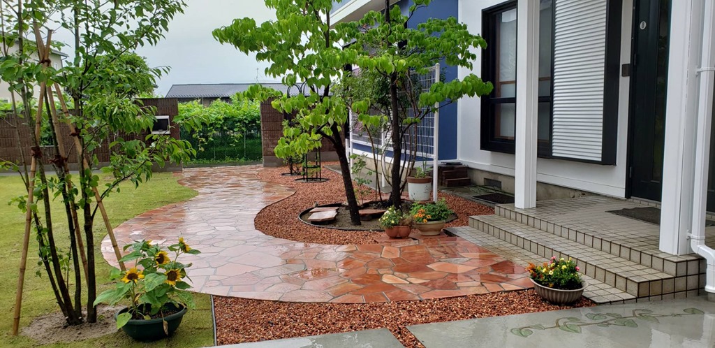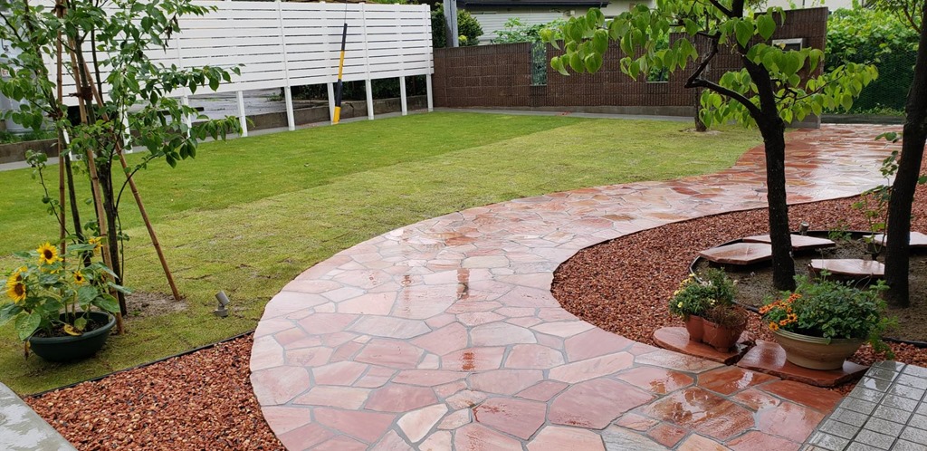 門から玄関に向かって直線だったインターロッキングを曲線の天然石にはりかえ、庭をおおっていた樹木などを撤去しお庭の全面に芝生をはり直しました。アオハダを新に植栽し、もともとあったバラは移植したものと新に植栽したものを配置しバランスよく整えました。草取りの手間がかからないよう防草シートの上にテコラ・ボーダーアートを入れたコンクリートテラスをつくり使えるお庭に。土の部分が減ると草取作業が格段に少なくなります。