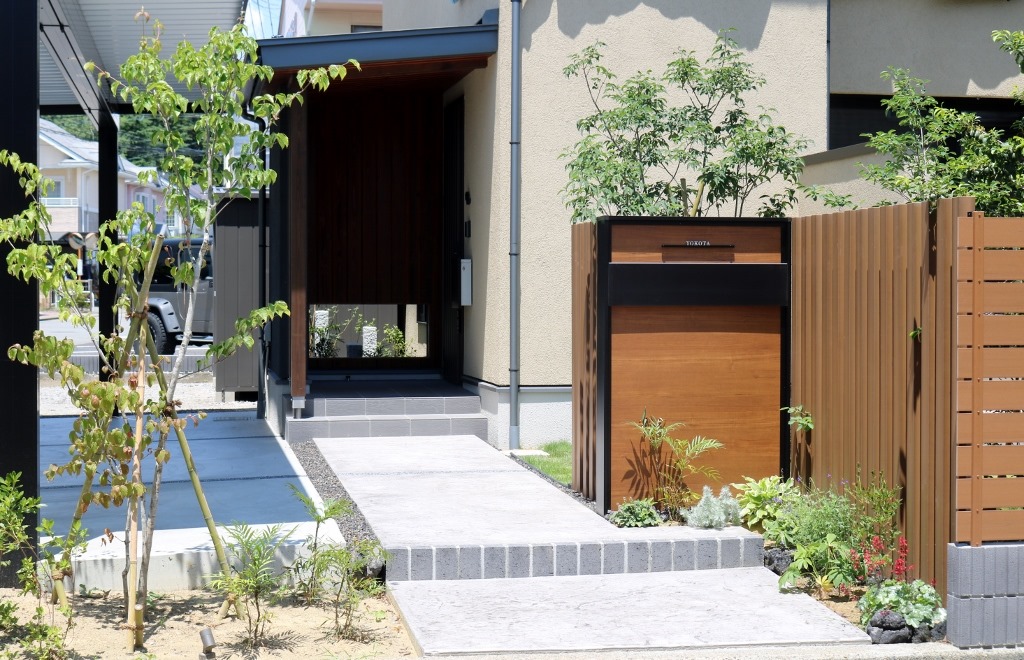 樹脂ポール「スレンダーポール」を門柱の高さに合わせて、全部で20本立て、完全な目隠しではなく庭が隙間から見える程度の目隠しで仕上げました。ルシアスウォールのカラーはキャラメルチーク/ブラックでスレンダーポールはオータムブラウン、マイティーウッドはチークブラウンと違った色ですが全体を見て上手く調和していると思います。花壇スペース・庭木も施工して素敵な現場に仕上りました。