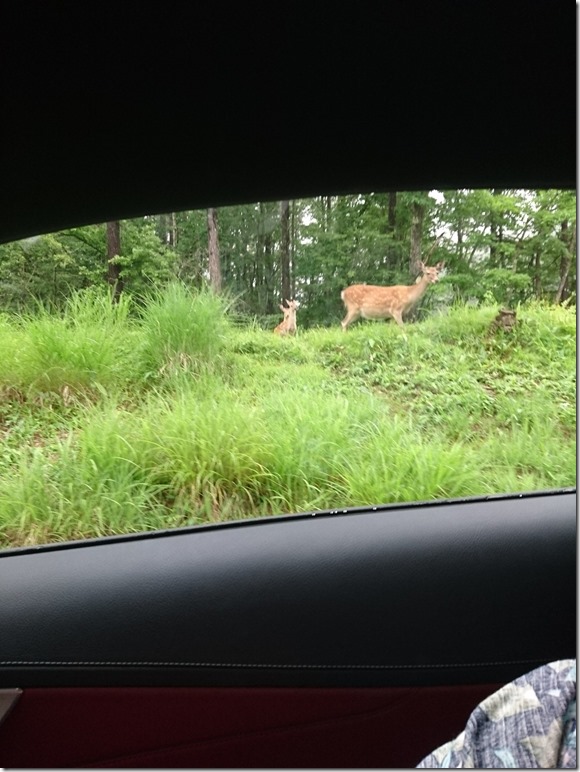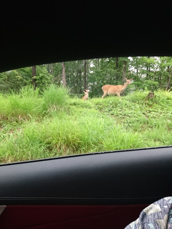 エクシブ蓼科に行ってきました。建物は「ブリティッシュカントリースタイル」をコンセプトにしているそうです。お天気が良くなくて、標高が高くなるにつれ霧が発生して、前を走る車がみえなくなるほどです。もうすぐ到着するころ目の前に道路を渡るシカが1頭・・・車を止めて渡りきるのを見ていると、横にはこれから道路を渡ろうとする親子が3頭待っているではないですか!大きなシカの時は思わなかったのですが、小鹿はなんともかわいい!!思わず車の中から写真を撮りました。こちらの様子を親のシカがじっと見ています。そして小鹿たちはお母さんが動くまで先には行きません。車が通りすぎると3頭で道路を渡り、先に渡ったもう1頭と一緒に森の中に入っていきました。