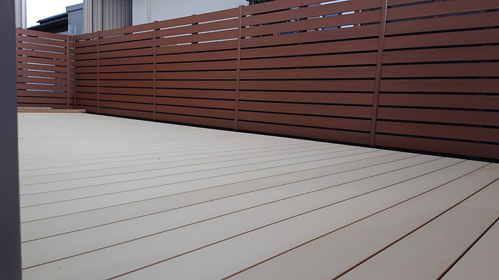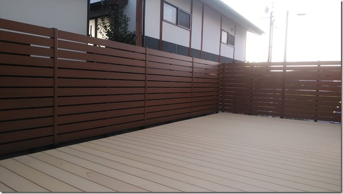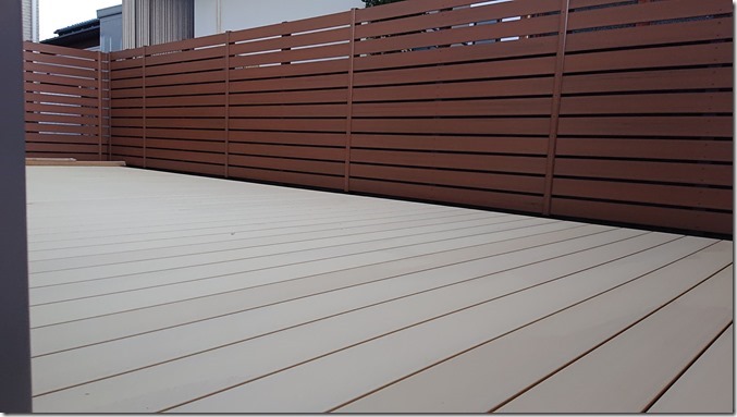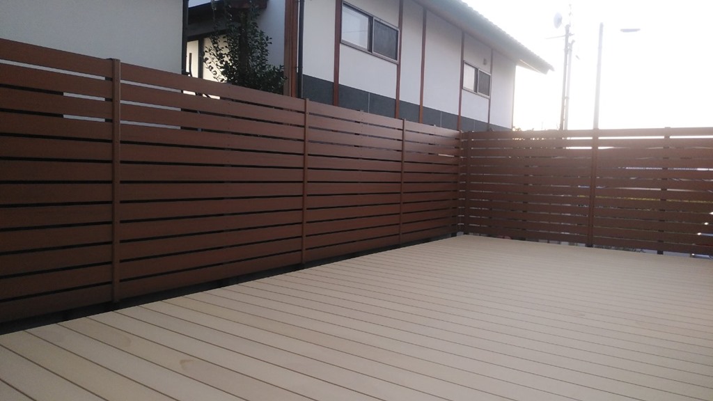 樹ら楽ステージの周りを木樹脂板、マイティーヴット巾120タイプを隙間20㍉空け12段張りで目カシ塀を作りました。外からの視線を気にする事なく樹脂でっきで過ごす事ができます。マイティーウッドのカラーはチークブラウンでマイティーウッドの中でも人気の色です。 施工する場所が隣地などの場合は、樹脂板を内側(家側)に張って仕上げる事が多いです柱部分が見えづらくなるのが打ち張りを希望する要因です。