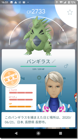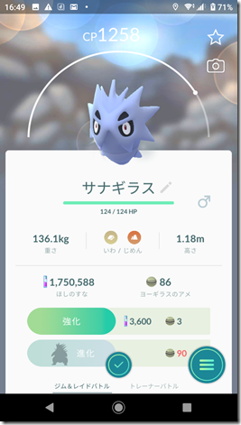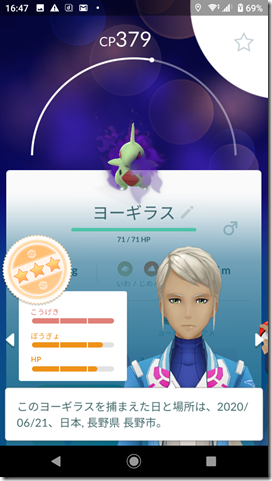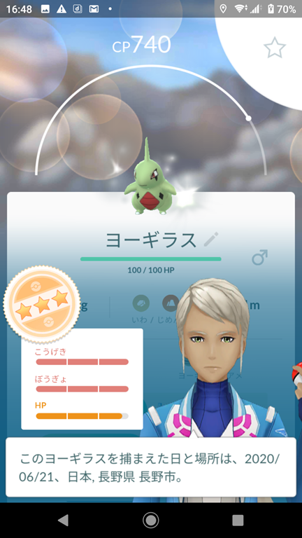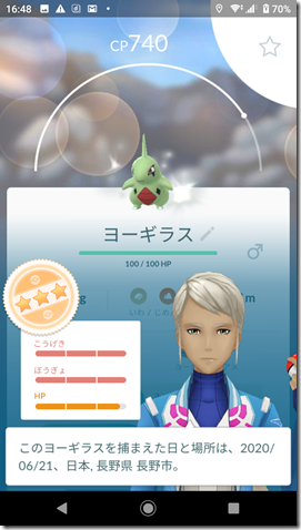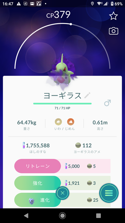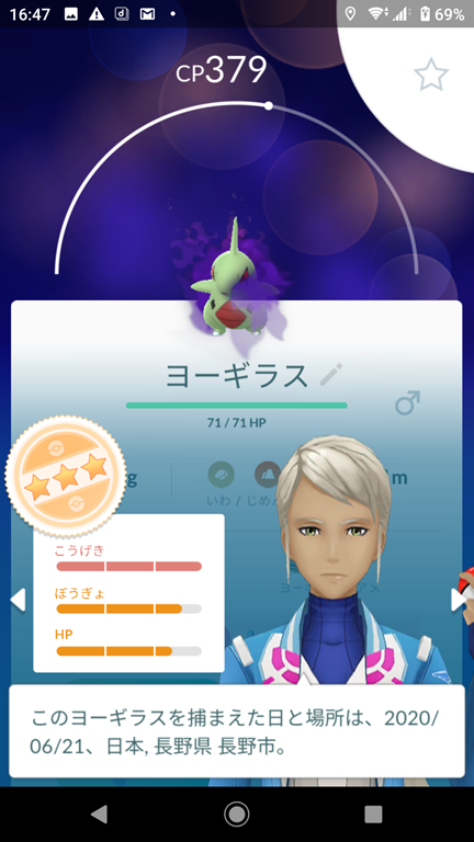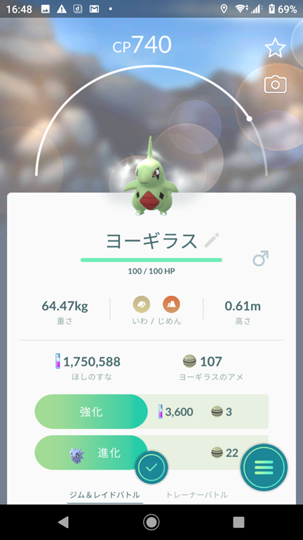 勝って捕獲したヨーギラスはCPが379で、こうげきが15・ぼうぎょが13・HPが12の40で、おしい個体値、シャドウポケモンでない場合は、42以上が欲しい。シャドウポケモンなのでリトレーンをすることが可能、星2以下の場合は、即博士送り。