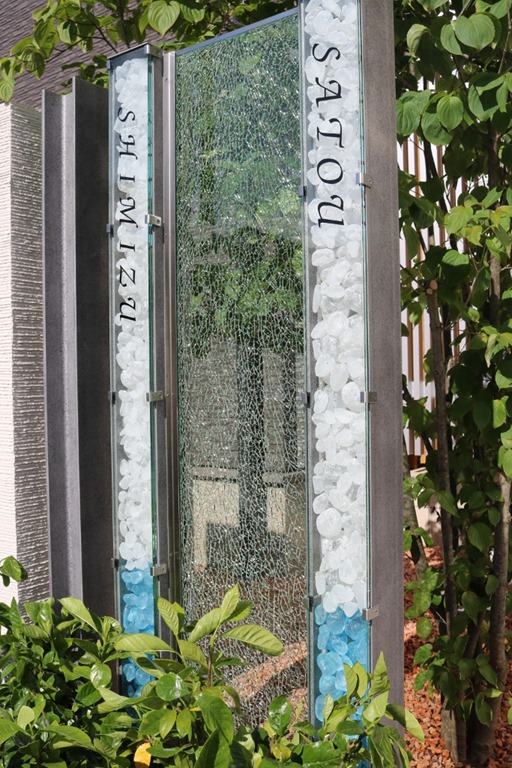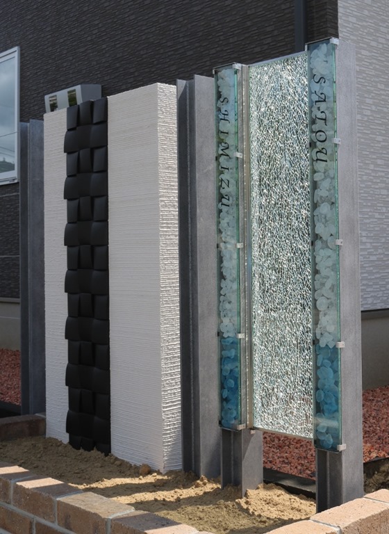 H鋼を特殊塗装の錆銀を施し、合わせガラスの縦120センチをサインにして中にリコストーンの上部にクリア・下部にブルーを閉じ込め中にLEDテープを取り付けH鋼の柱の間にジュエルグラスを挟み込んだ門柱です。車の通りが激しい場所なので門柱の巾を広く取りたくてH鋼の横に塗り壁の塀も作りました。 LEDが点灯してリコストーンが綺麗に見える夜の画像が撮れたらまた、アップします。