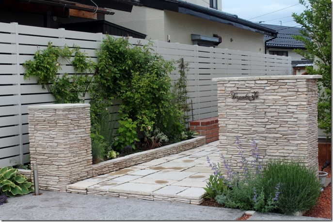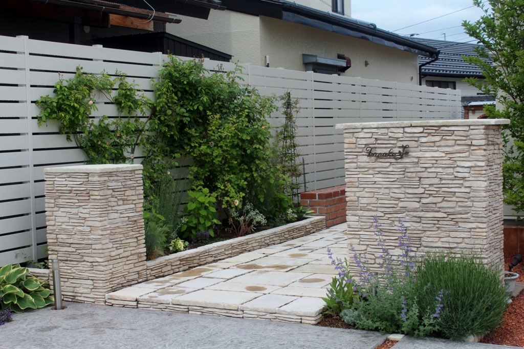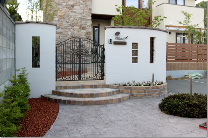 エクステリアには、オープンタイプとクローズタイプがあり、両サイドに門柱があり、門扉が取り付けられているタイプがクローズで、以前は、クローズが圧倒的に多く門柱には表札・ポストがあります。 最近は門扉の無いオープンタイプが多いです。 時代と共にスタイルも変化しています。 門柱の仕上げ方法も、以前は化粧ブロック積みが多かったので施工も早かったのですが、近年は手の掛かる門柱が多いです。