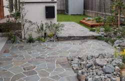 アプローチは諏訪鉄平石を乱張りにして、立ち上がりをコバ積みにするという手の込んだ仕様となっています…