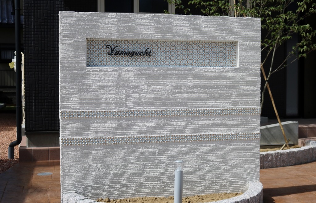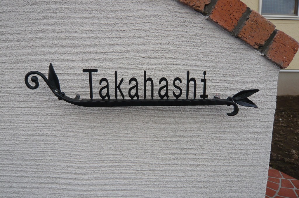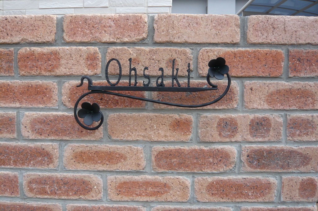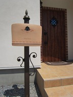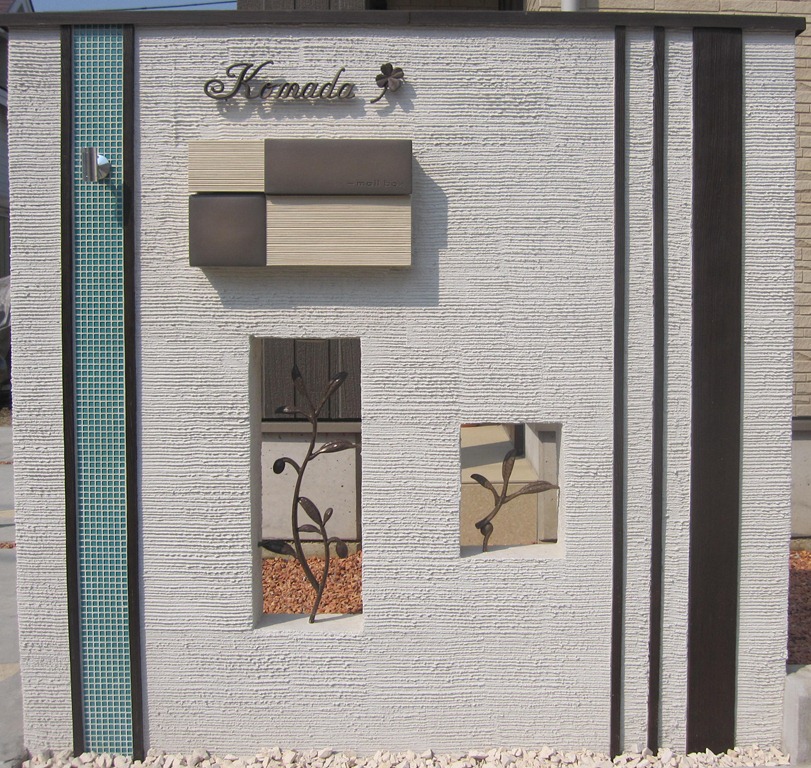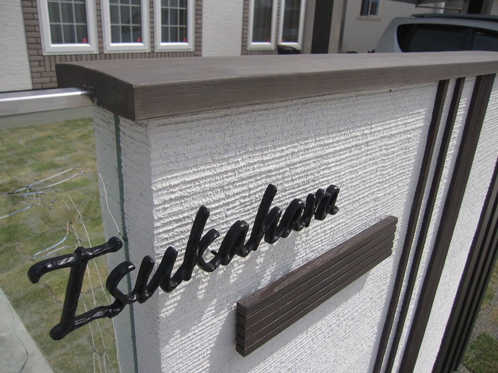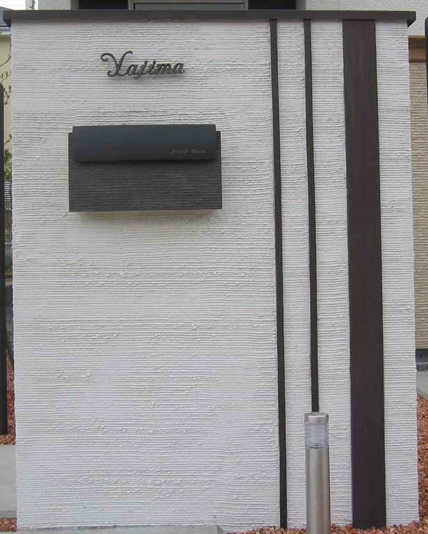 表札は ディーズサインA-03のブラックを使用しています、アルミ鋳物でできているので錆る事が無く、門柱の壁を汚すことがありません鍛鉄風の文字は飽きる事の無い素敵な表札に仕上げています。ミニオーナメント 表札の横に一緒にミニオーナメントを施工することが多いです6タイプあるミニオーナメントは、サインと同じ鍛鉄風にしあげられ素敵なアクセントになりますStucco-U ポストは門柱埋め込み式でスタッコ塗りとスペイン瓦をイメージしたデザインでFRP制の素材で作られた耐久性の良い商品です。表札灯 サインの斜め上に取り付けられた葉っぱの形の表札灯リーフはデザインも素敵でLEDの照明がサインを照らしてくれます。