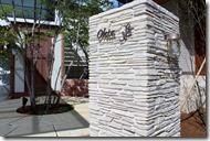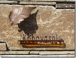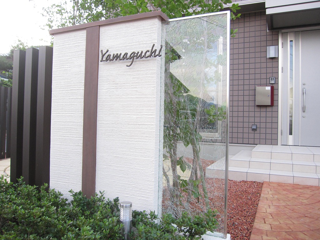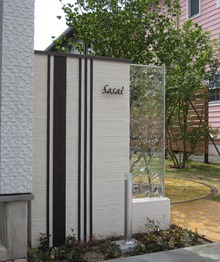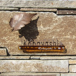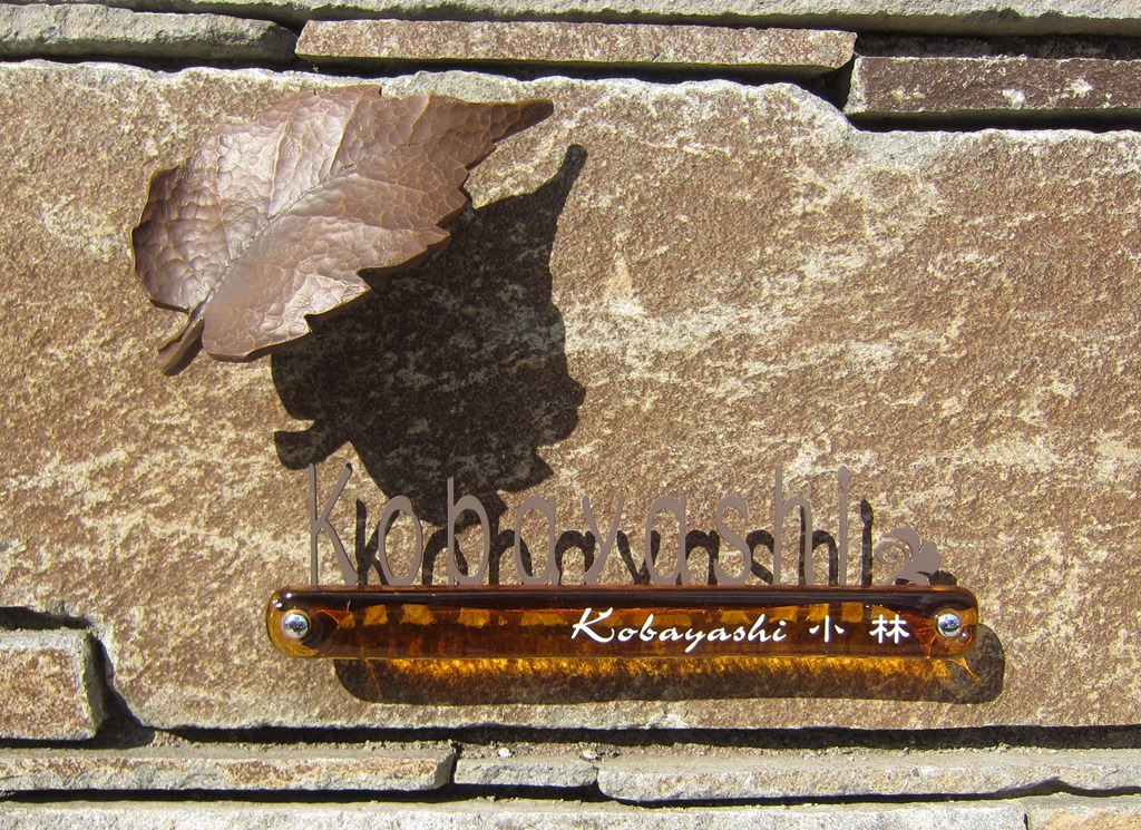 ●自然石が貼られた門柱の壁に、ガラスバーとステンレスの切り文字が組み合わされたGlassCollectionジーフォー本来ならば和のイメージが強い国産の自然石に上手く調和しているから不思議だ、表札灯りのリーフもブロンズカラーで自然な感じに見えている、ガラスとステンレスと自然石の組み合わせ。