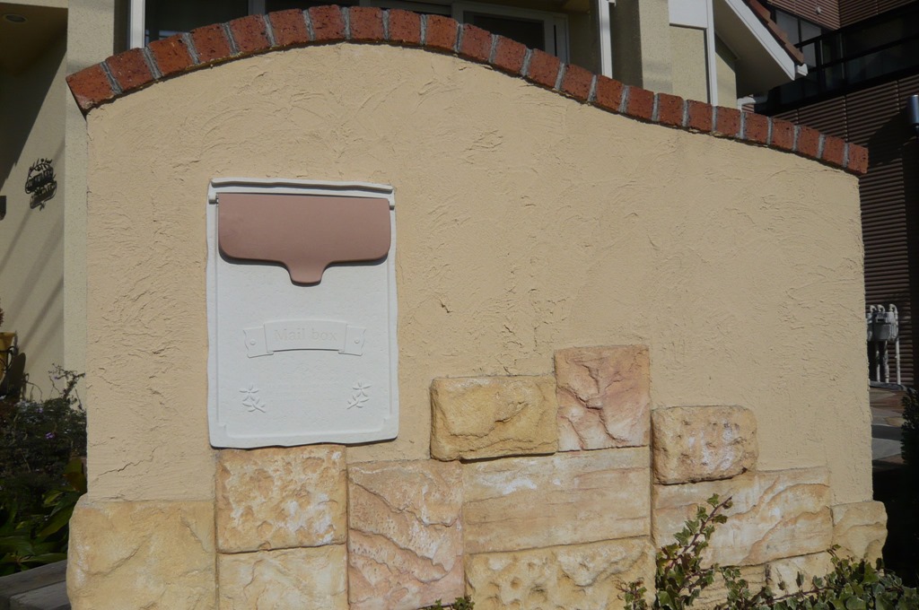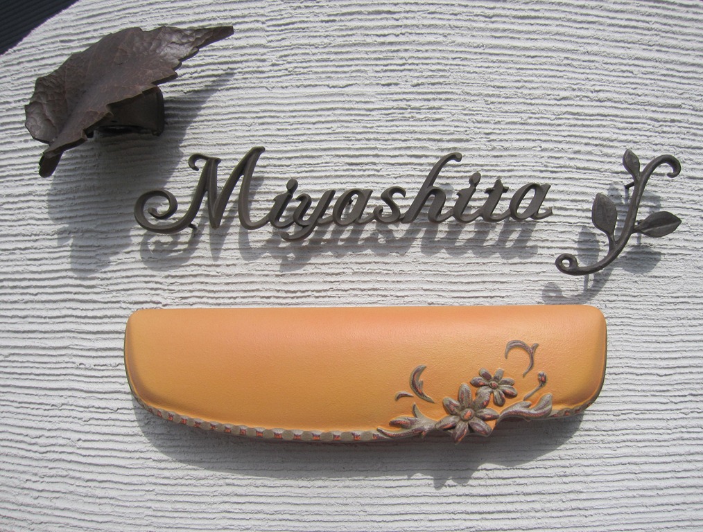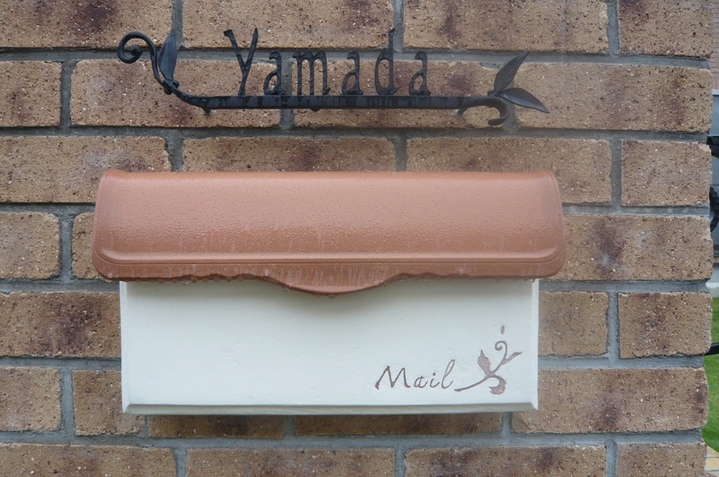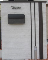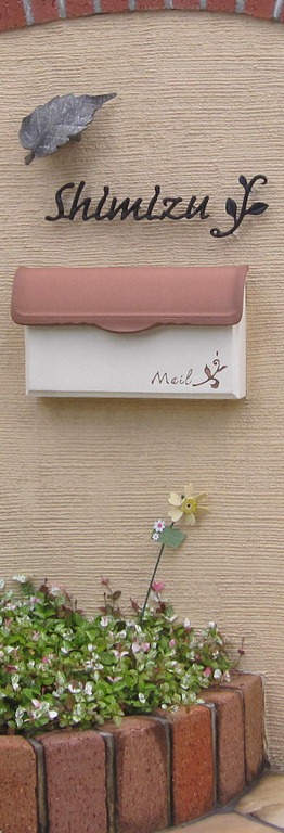 ●白い塗壁に映えるオレンジカラーのポストPouch-Fポーチ-F埋め込みタイプのポストで取り出し口の裏側にはダイヤル錠が付いていてセキュリティーもOK、鋳物アルミサインはA-07でエレガントタイプ右横に付いているミニオーナメントは人気のA型、リーフ表札灯が素敵だ。