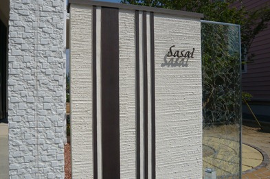 門柱には、ディーズアイテムが五つあります、アルミ鋳物のディーズサインA-07ショコラブラウン・ディーズポストのスクエア-Uセピア・門柱の笠木はFRP製のディーズデコ・壁に取り付けた縦ラインはこちらもFRP製のハーフティンバーの100mmと20m巾、門柱の後ろにあって目立ちながらも違和感のないカンナ物置フォルテ、庭との境にはFRP製のポール、ティンバーで道路側には目隠し塀にブロック上に樹脂板のアルファウッドとディーズガーデンの商品がいっぱいの施工現場です。 長野市の施工現場です。 この現場で使用したディーズガーデンアイテム