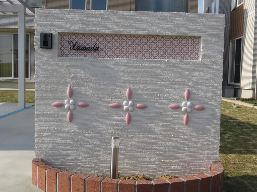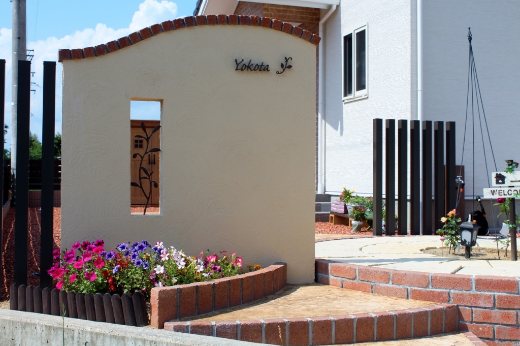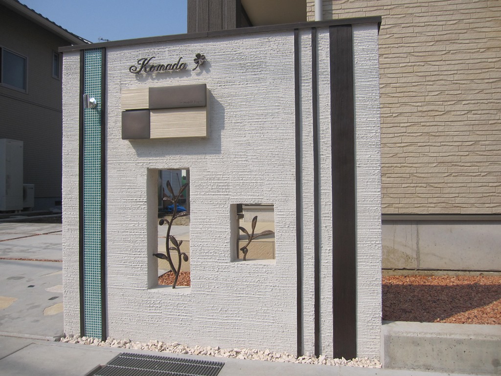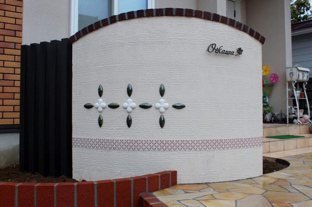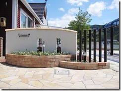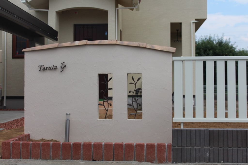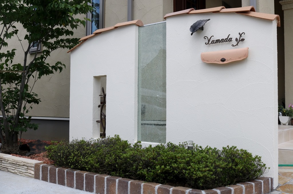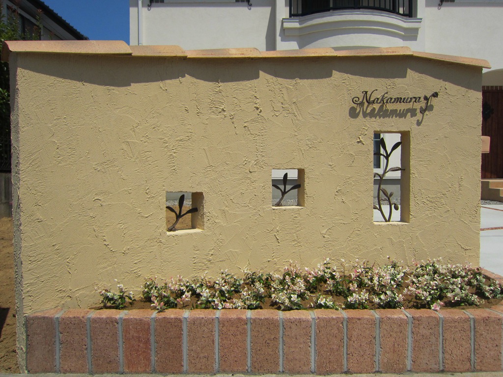 洋風瓦を乗せジョリパツト塗仕上げされた曲線のある門柱にディーズガーテンのエクステリアイテム、サイン・ポスト・ミニオーナメント・表札灯・Rフィックスフェンスを取り付けています。アルミ鋳物サインはA-07・ミニオーナメントはA型ポストはテラコッタをイメージしたプロバンススタイルの可愛いデザインのポーチF埋め込みタイプ表札灯はアイアンカラーでリーフデザイン・スリツトに取り付けたのがRフィックスフェンス2型02-06