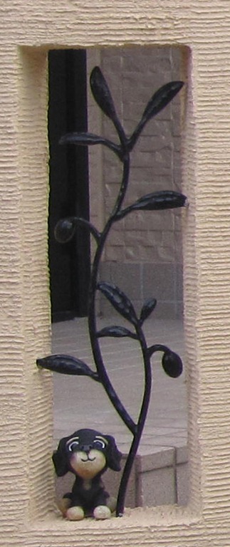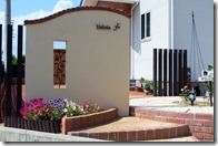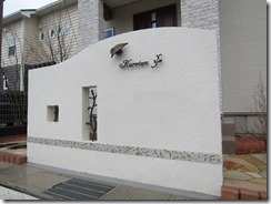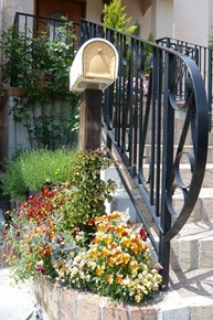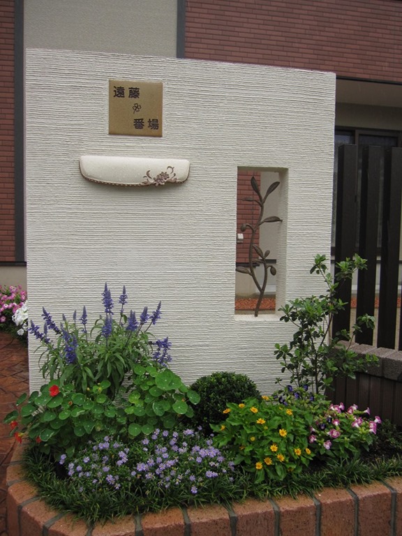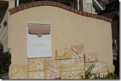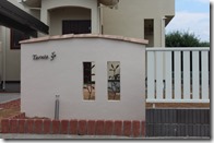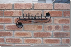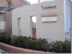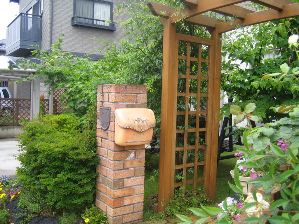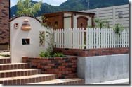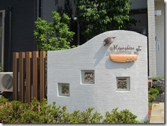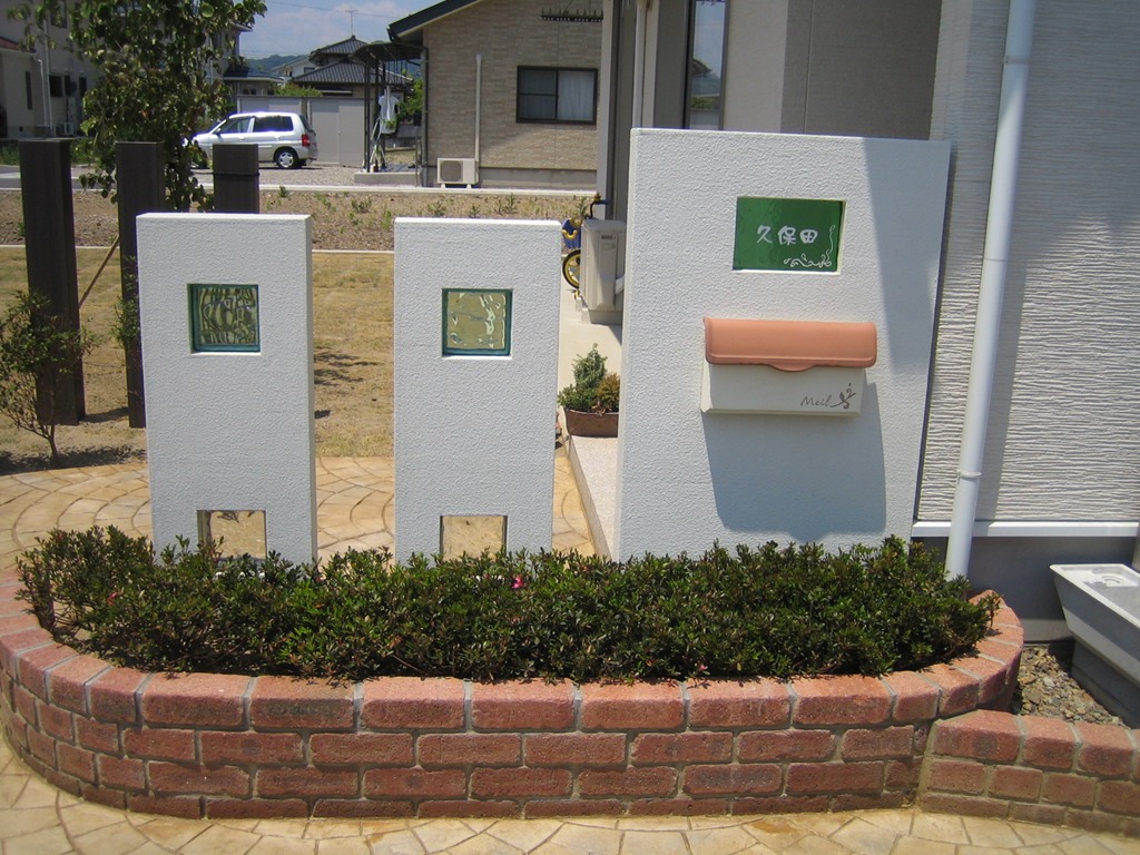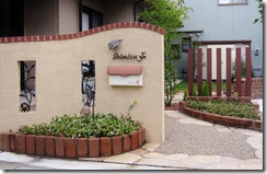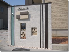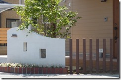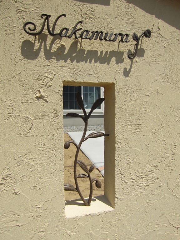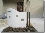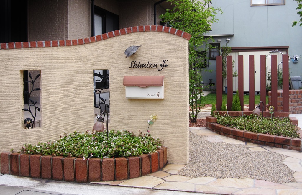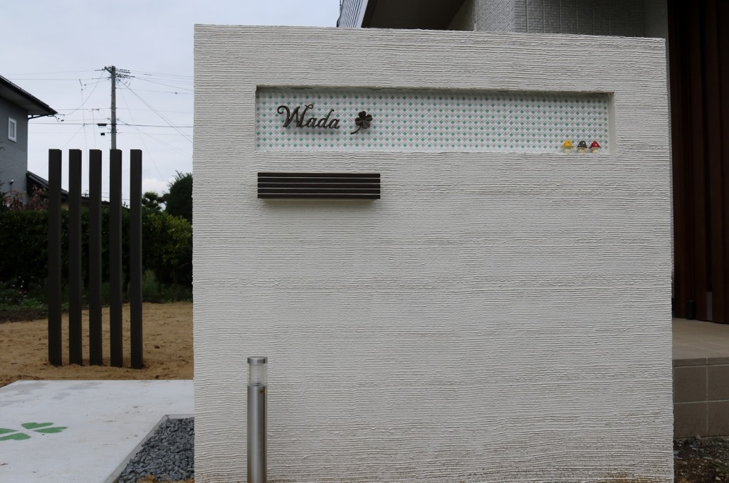 洋風瓦を乗せジョリパツト塗仕上げされた曲線のある門柱にディーズガーテンのエクステリアイテム、サイン・ポスト・ミニオーナメント・表札灯・Rフィックスフェンスを取り付けています。アルミ鋳物サインはA-07・ミニオーナメントはA型ポストはテラコッタをイメージしたプロバンススタイルの可愛いデザインのポーチF埋め込みタイプ表札灯はアイアンカラーでリーフデザイン・スリツトに取り付けたのがRフィックスフェンス2型02-06