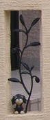 レンヌ門扉の取り付けられたレンガの壁に、ディーズガーデンのアイビーの葉をロートアイアン調に表現された表札灯・その下には鍛鉄風テクスチャーがついたシンプルな文字タイプ鋳物表札A-03ショコラブラウン、その横に薔薇の形をしたミニオーナメント。ショコラブラウンカラー・ミニオーナメントはディーズガーデンらしい商品です。