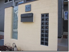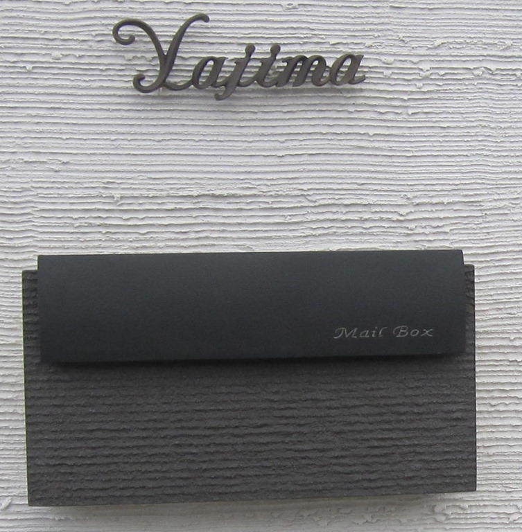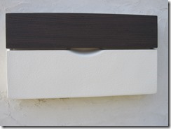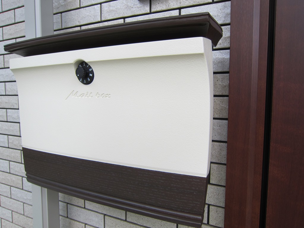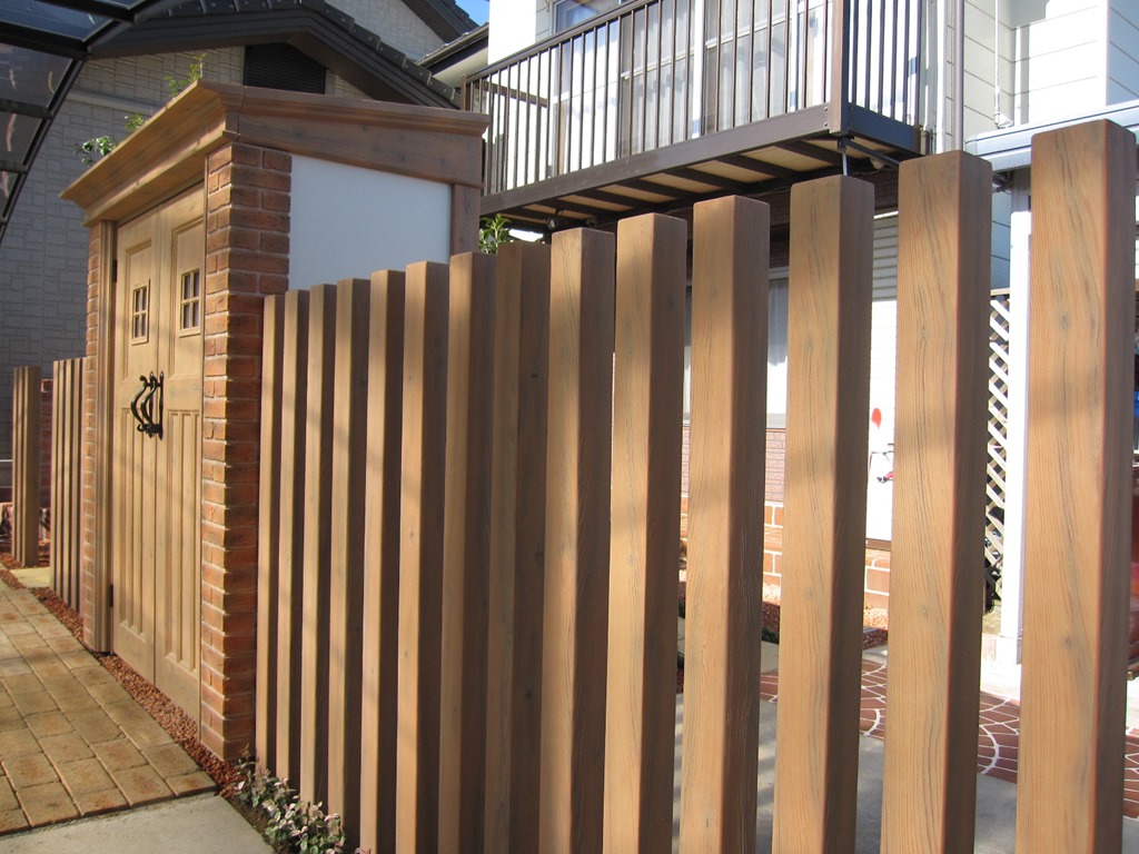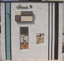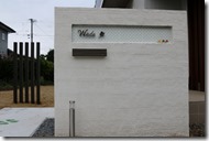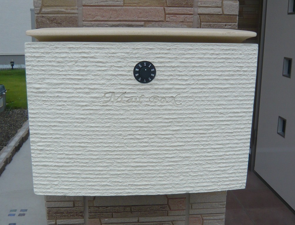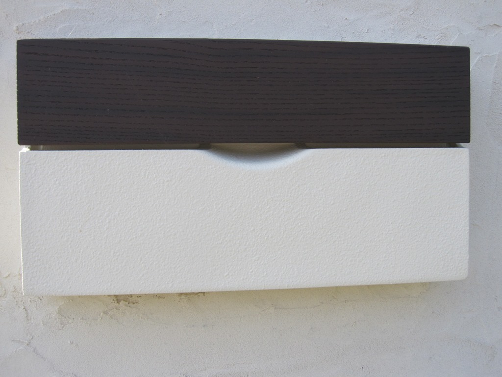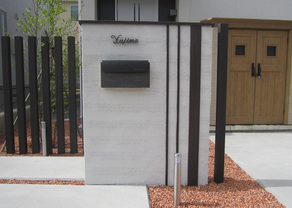 塗壁の中央を縦に直線のラインが3本20mm巾が2本に100mm巾が1本で、合計で3本のライン、ストレートに仕上げられた笠木も同じ材質のディーズデコで、どちらもFRP(繊維強化プラスチック)製で耐久性の強い商品で、表面は本物の木と間違えてしまいそうな出来です、埋め込みタイプのポスト口もスッキリとして良い感じです。