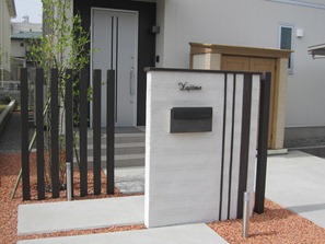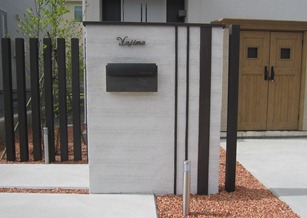 中側 シンプルにまとめた門柱はアルミ鋳物のA-07アールブラックでポストはDune-UデューンーUウィザープラックです。