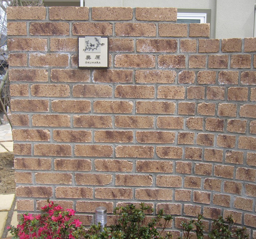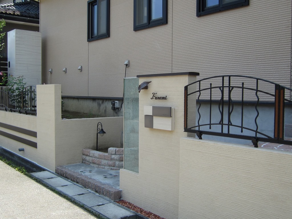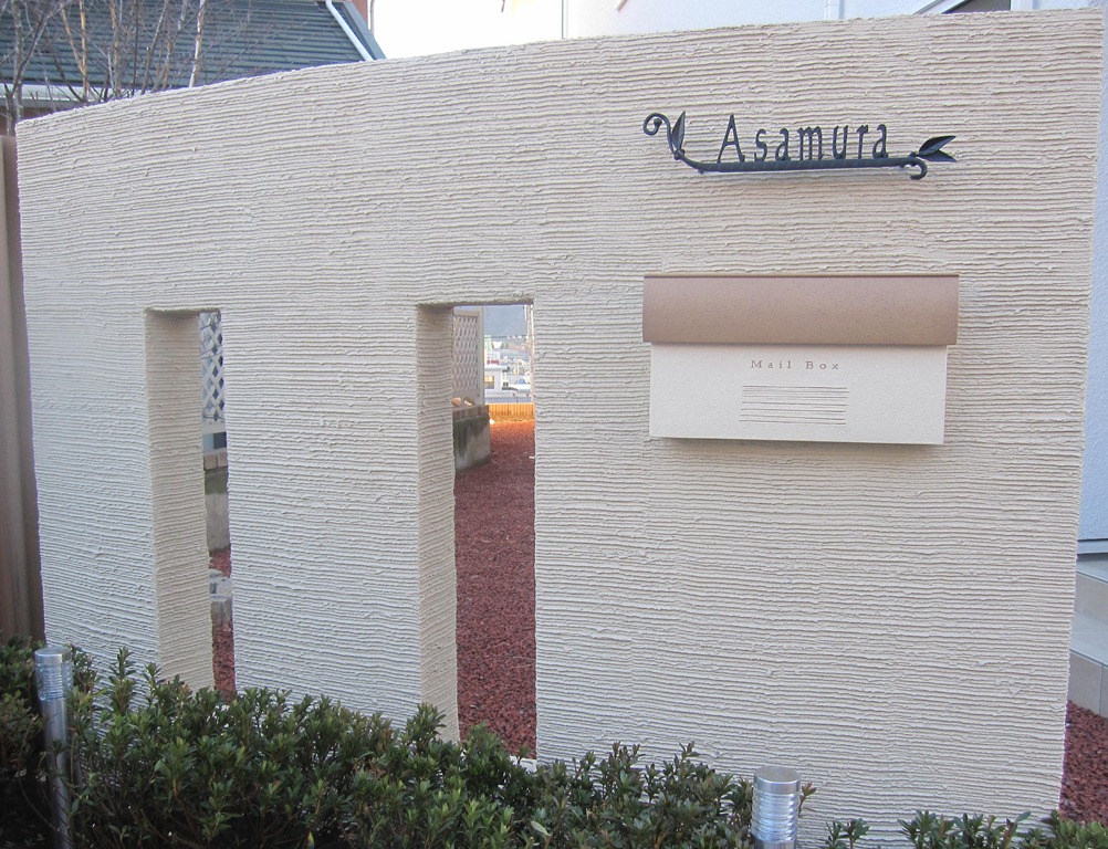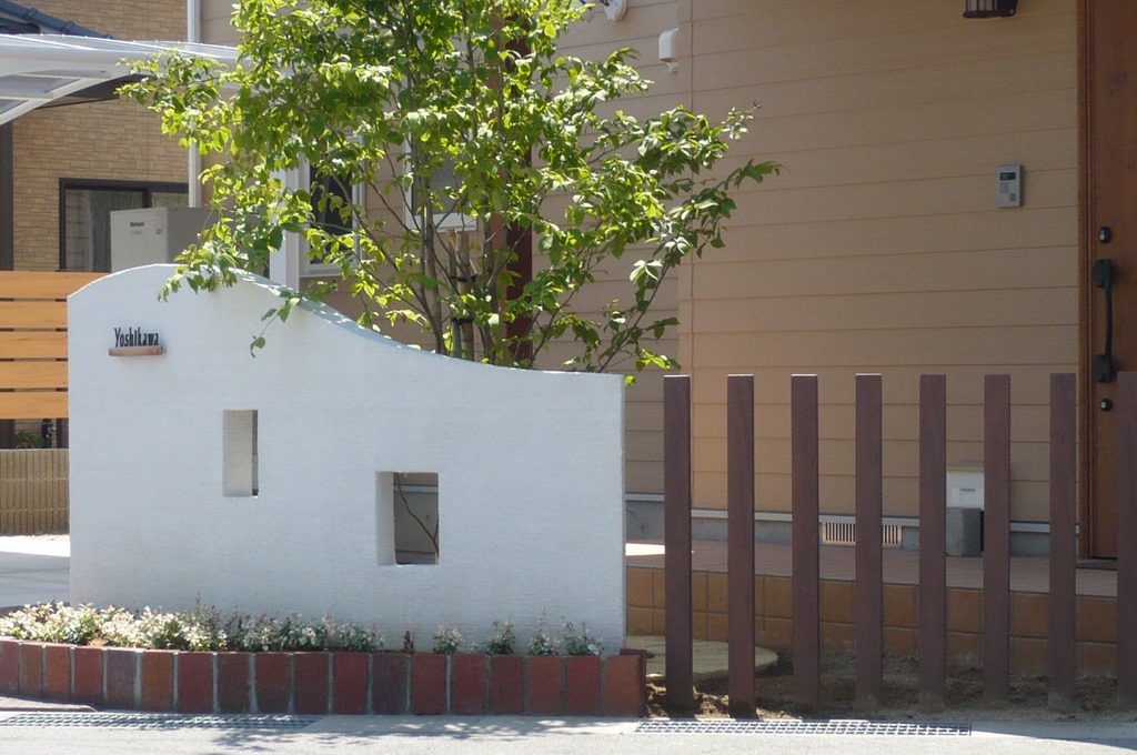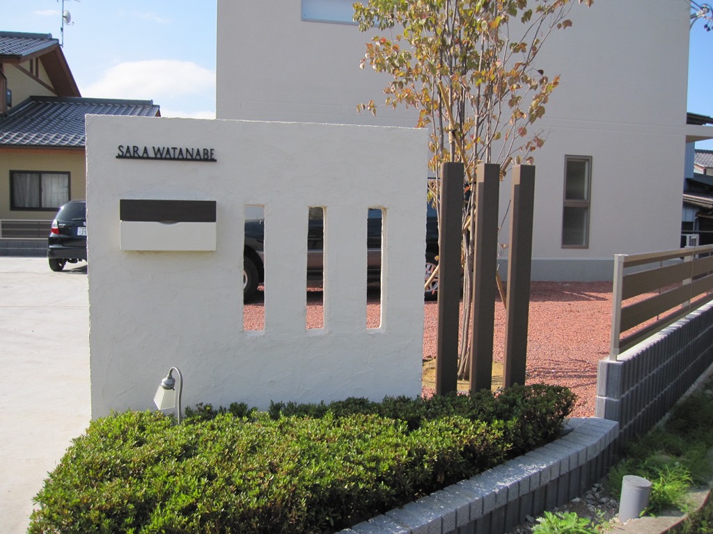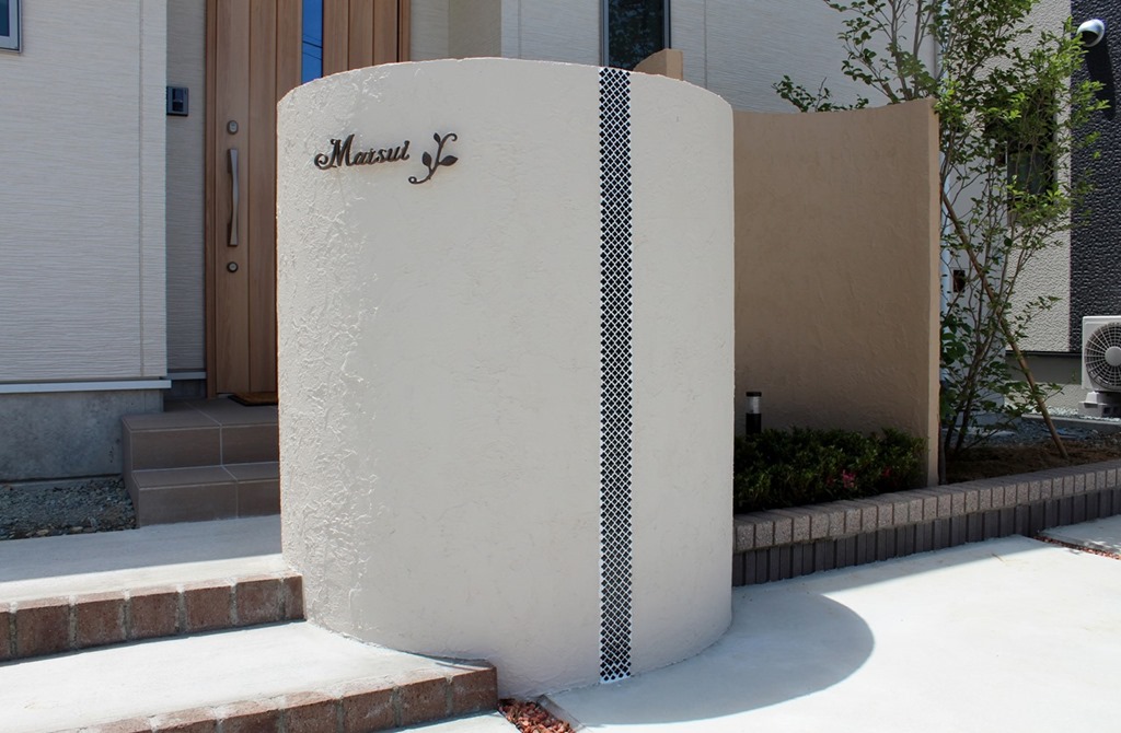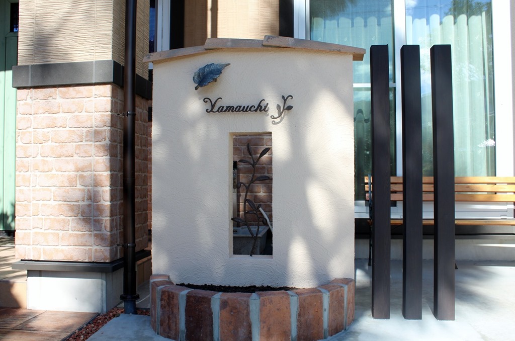 門柱の天端も雰囲気に合わせてアールに加工をし、サインにはディーズサインG-05ピンクベージュ、ポストにはスタッコ-Uのブラウン、インターホンカバーも磁器でできたC-13ホワイト、表札灯にはウォールウォッシャーテラコッタ タイプAのブラウン、スリットにはアールフィックスフェンス4型02-06を使用しています。
