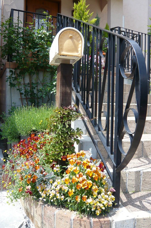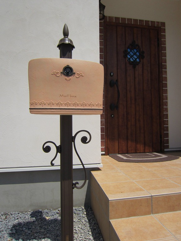 ポストは門柱に付けづに玄関前にメールボックスポールを立てアンティークモダンなフランスの雑貨をイメージして