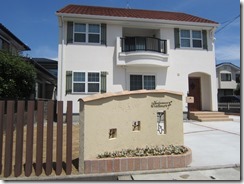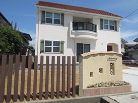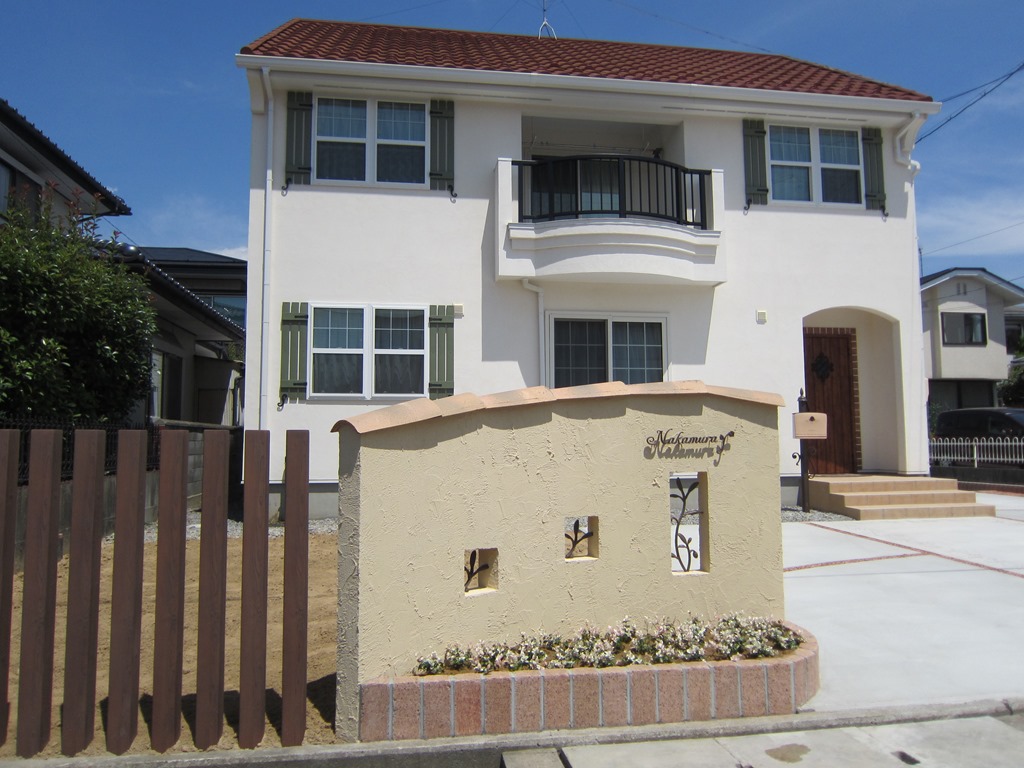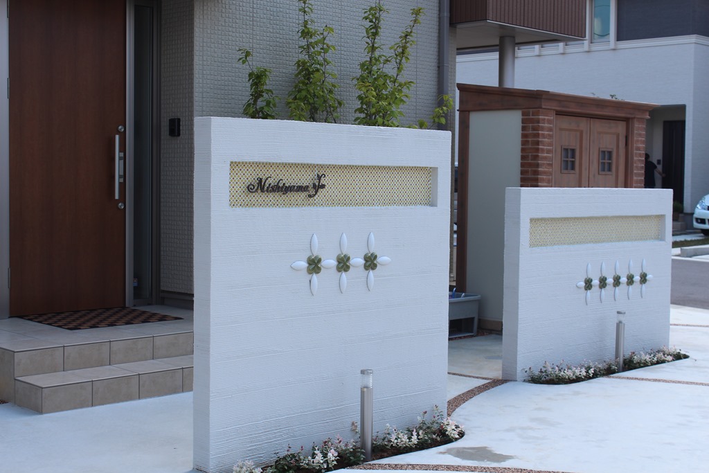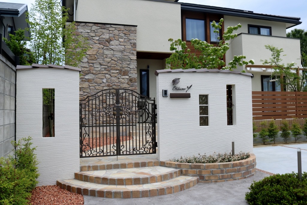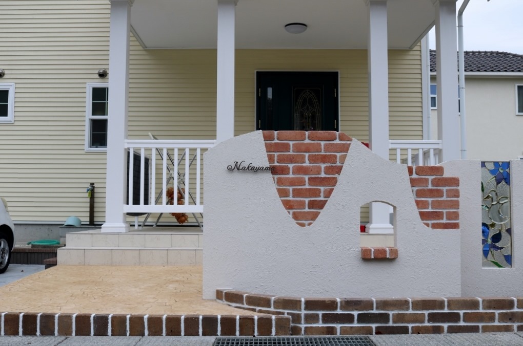 塗壁門柱にブロバンス瓦を乗せると、太陽の陽射しをいっぱい受けた明るい感じの洋風のエクステリア
