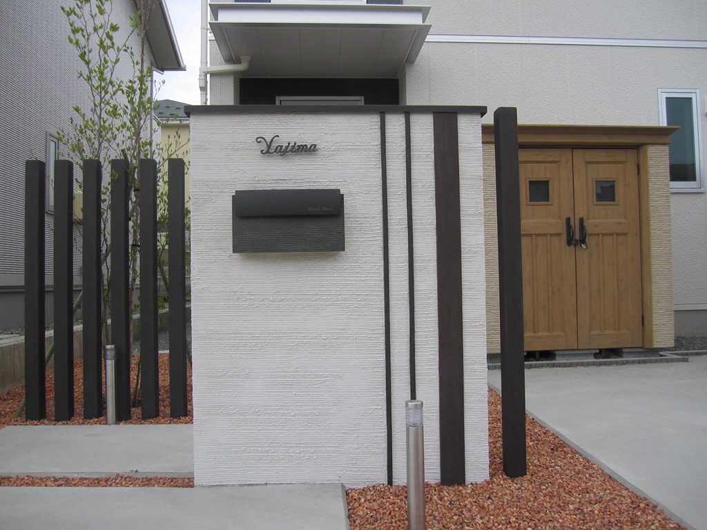 洋風の建物に、カンナ物置が良く似合っています。 サイン・ポスト・表札灯・インターホンカバー・Rフィックスフェンス・アルファウッドそしてカンナ物置と、ディーズガーデン商品がいっぱいのエクステリア施工現場です。