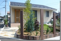 駐車スペースを作ると庭が無くなってしまうので、玄関前に小さな庭空間を作りました。カンナキュートがある事で素敵な庭になっています。
