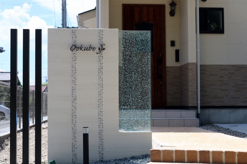 ハーフティンバーを5本使った現場です、直線のラインだけで見せる外構(エクステリア)は飽きのこないシンプルな外構です、シンプルな門柱には合わせてジュエルグラスを組み込んだ現場がとても人気があります。