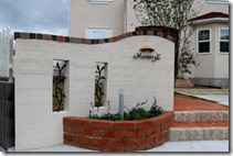 壁の中に作られたスリットは二ヵ所あり、どちらにも、アルミ鋳物で錆びることの無いアールフィックスフェン2型の02-06のサイズを取り付け、風と光がいっぱい取り込む事ができます、素敵な外構の壁になりました。