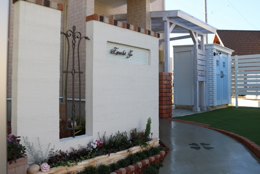 隣地境界にカンナ物置フレンチシック・シャビーブルーを設置して横にウォールBを建てた現場です。 アプローチの横に角柱ショートAを建てサインをA-07で角柱の右側にサイドフェンスEを、玄関の壁にはディーズポストアンジュ・シャンパンピンクを取付けています。
