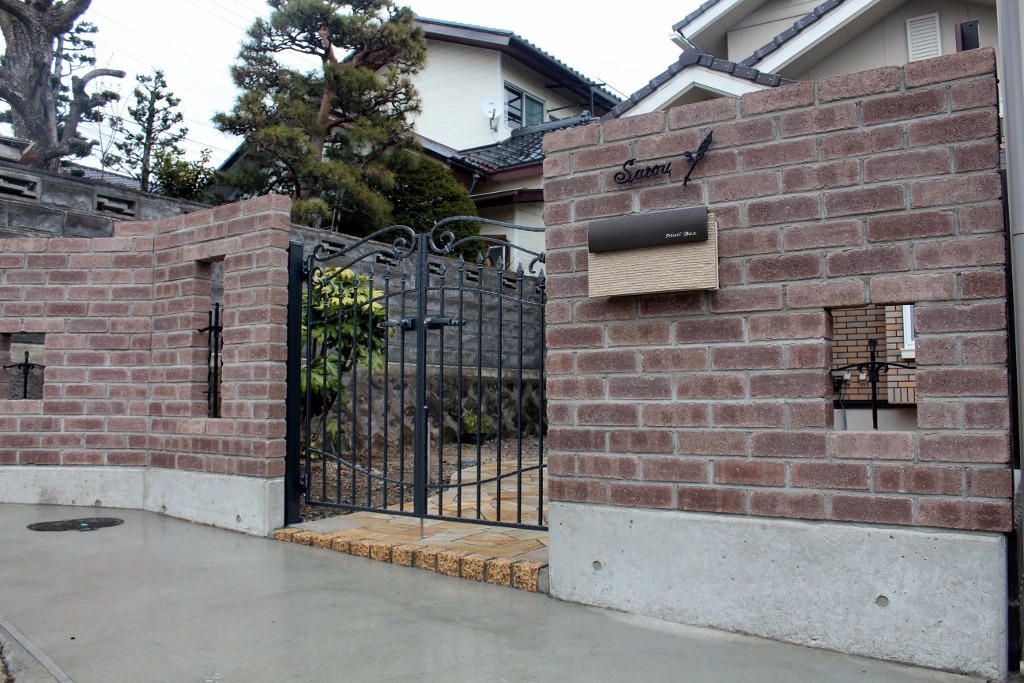 レンガ積の門柱に取り付けられたアルミ鋳物門扉、ディーズガーデンのレンヌのある風景は、まるでヨーロツパの町並みに出会えた感じのする外構です。